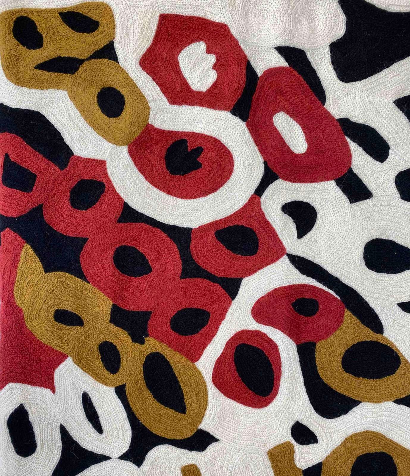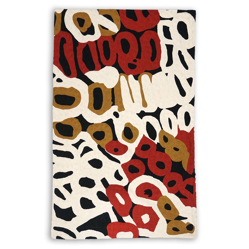 These beautiful, unique textiles are a cross-cultural collaboration combining Aboriginal designs and traditional Kashmiri rug-making techniques. Chain stitched, using hand dyed wool, each is a completely handmade piece. A more empowering way to work, this brings many direct benefits to the artists’ and their community. Control and ownership of intellectual property are also maintained. Purchase of these products guarantees a direct return to the Aboriginal artist and their community.