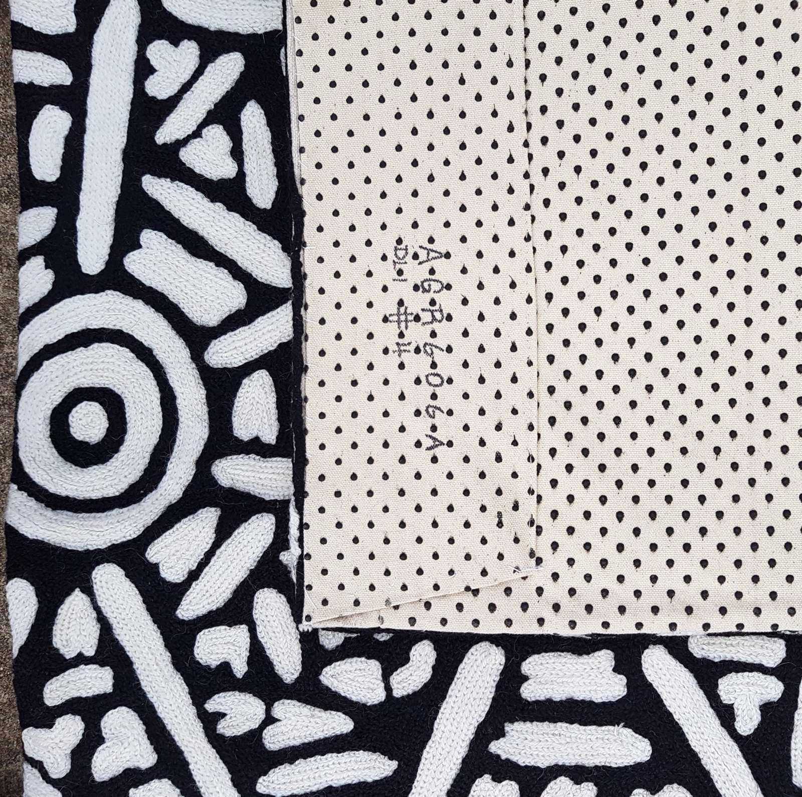 Chain-stitched kilims are a traditional rug/soft furnishings making technique from Kashmir. As people sat on the floor they were both homewares and decoration. As many artworks are painted on the ground or 3D surfaces/bodies most of the images do not have a set orientation so can also be hung portrait or landscape if preferred.