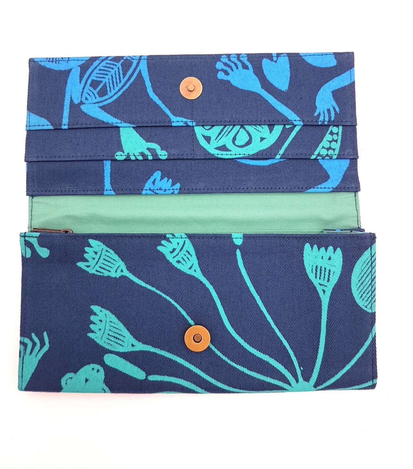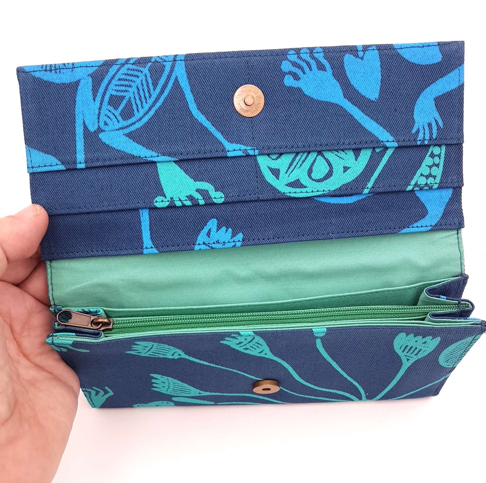 This design was a labour of love with its beautifully rendered amphibians. Lovely to carry – our Carla purse is well-crafted, practical and durable. Plus it looks great in limited edition hand printed fabric. Carla will keep your cards, coins and cash in order. We get many repeat customers for this one.
