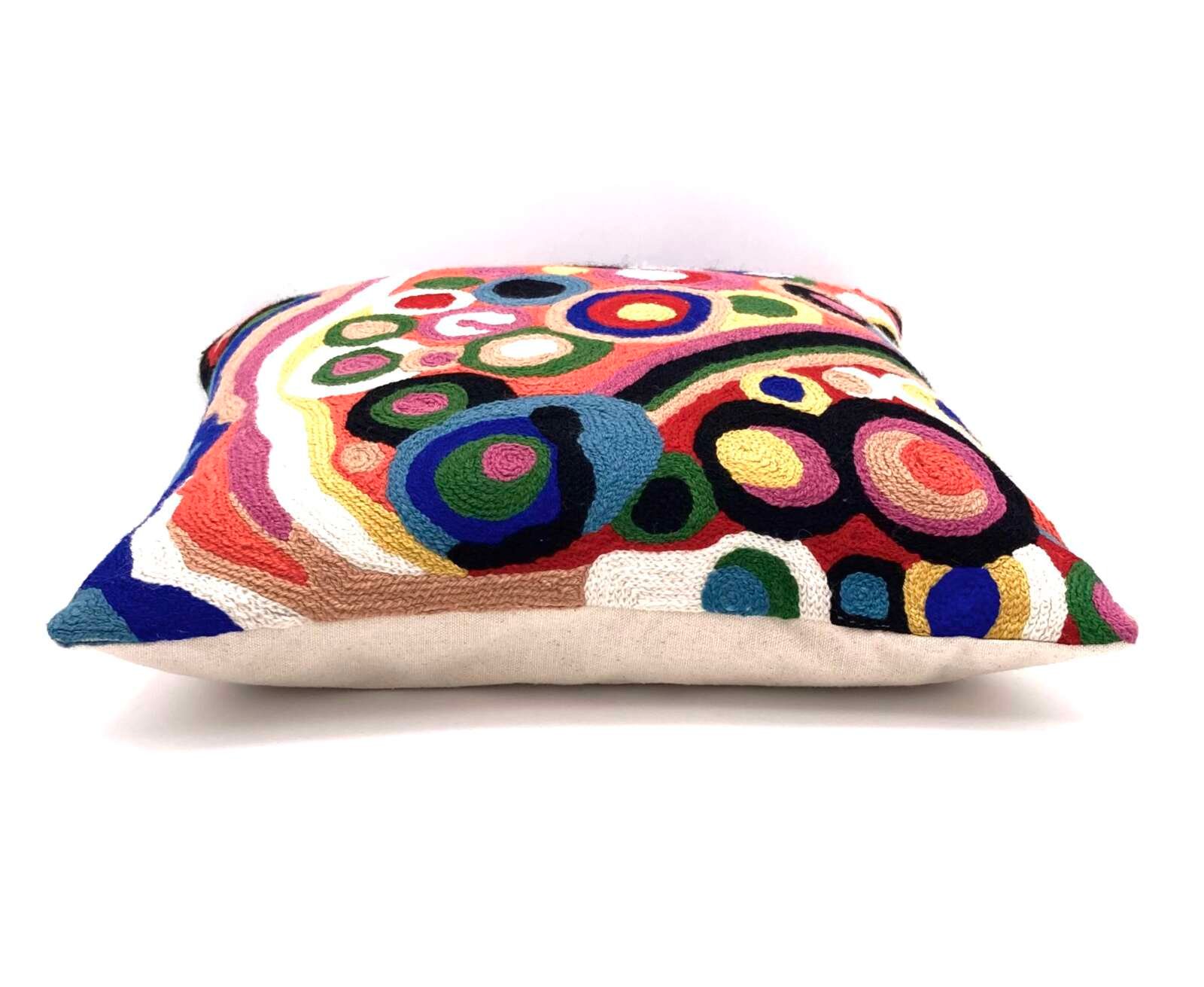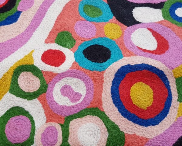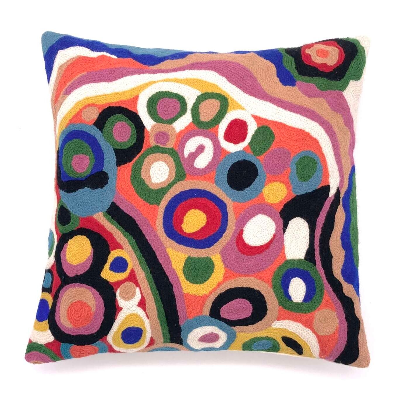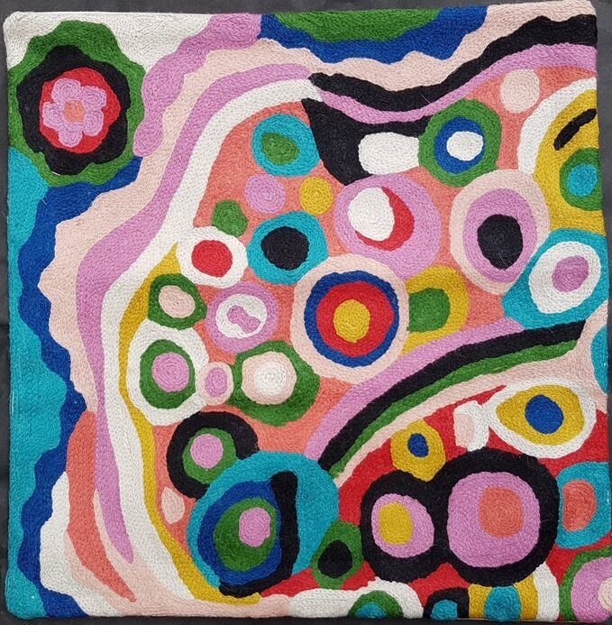 These beautiful, unique textiles are a cross-cultural collaboration combining Aboriginal designs and traditional Kashmiri rug-making techniques. Chain stitched, using hand dyed wool, each is a completely handmade piece. A more empowering way to work, this brings many direct benefits to the artists’ and their community. Control and ownership of intellectual property are also maintained. Purchase of these products guarantees a direct return to the Aboriginal artist and their community.