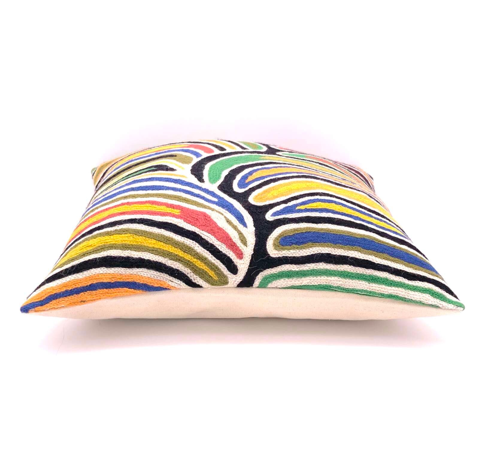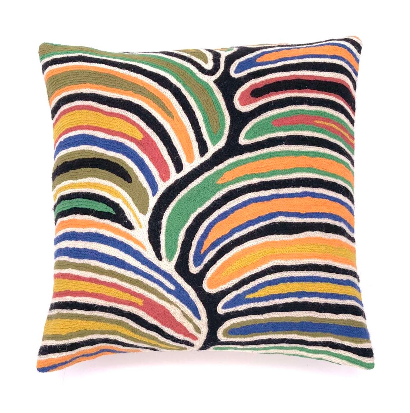 These beautiful, unique textiles are a cross-cultural collaboration combining Aboriginal designs and traditional Kashmiri rug-making techniques. Chain stitched, using hand dyed wool, each is a completely handmade piece. A more empowering way to work, this brings many direct benefits to the artists’ and their community. Control and ownership of intellectual property are also maintained. Purchase of these products guarantees a direct return to the Aboriginal artist and their community.
