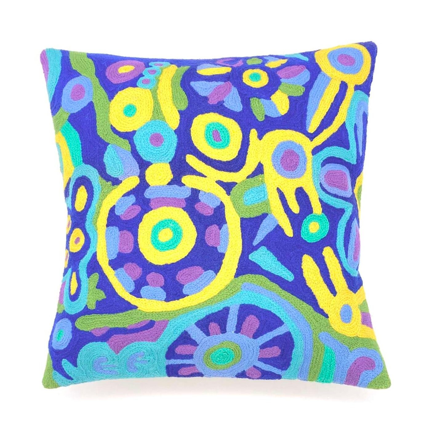 These beautiful, unique textiles are a cross-cultural collaboration combining Aboriginal designs and traditional Kashmiri rug-making techniques. Chain stitched, using hand dyed wool, each is a completely handmade piece. A more empowering way to work, this brings many direct benefits to the artists’ and their community. Control and ownership of intellectual property are also maintained. Purchase of these products guarantees a direct return to the Aboriginal artist and their community.