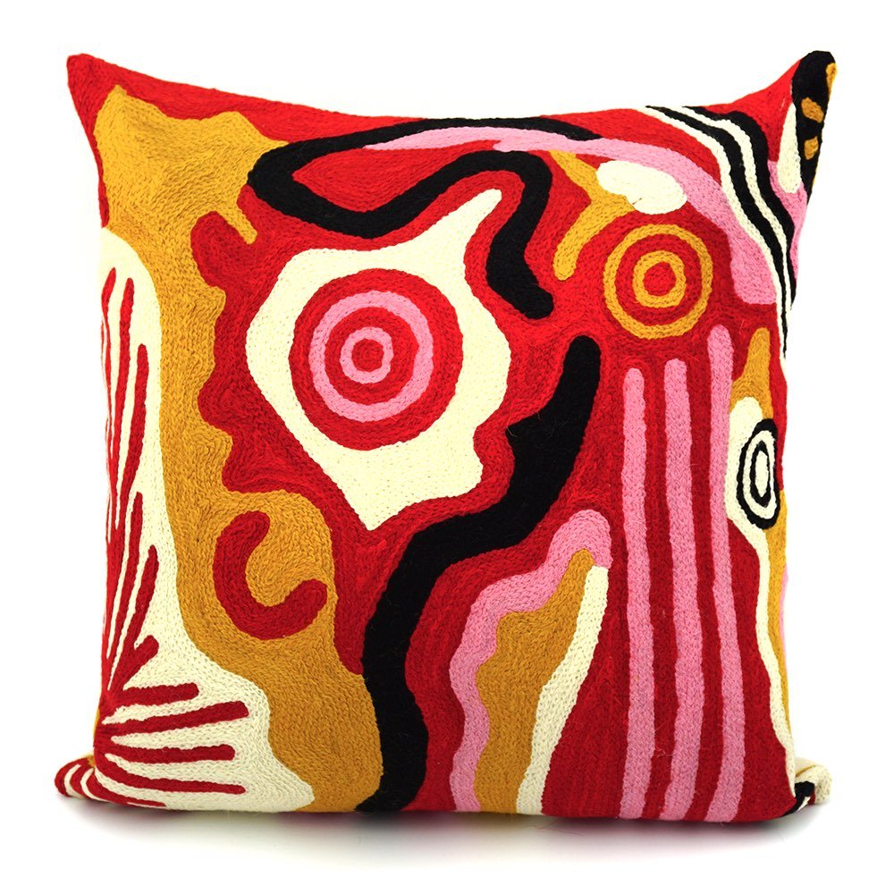 These beautiful, unique textiles are a cross-cultural collaboration combining Aboriginal designs and traditional Kashmiri rug-making techniques. Chain stitched, using hand dyed wool, each is a completely handmade piece. A more empowering way to work, this brings many direct benefits to the artists’ and their community. Control and ownership of intellectual property are also maintained. Purchase of these products guarantees a direct return to the Aboriginal artist and their community.