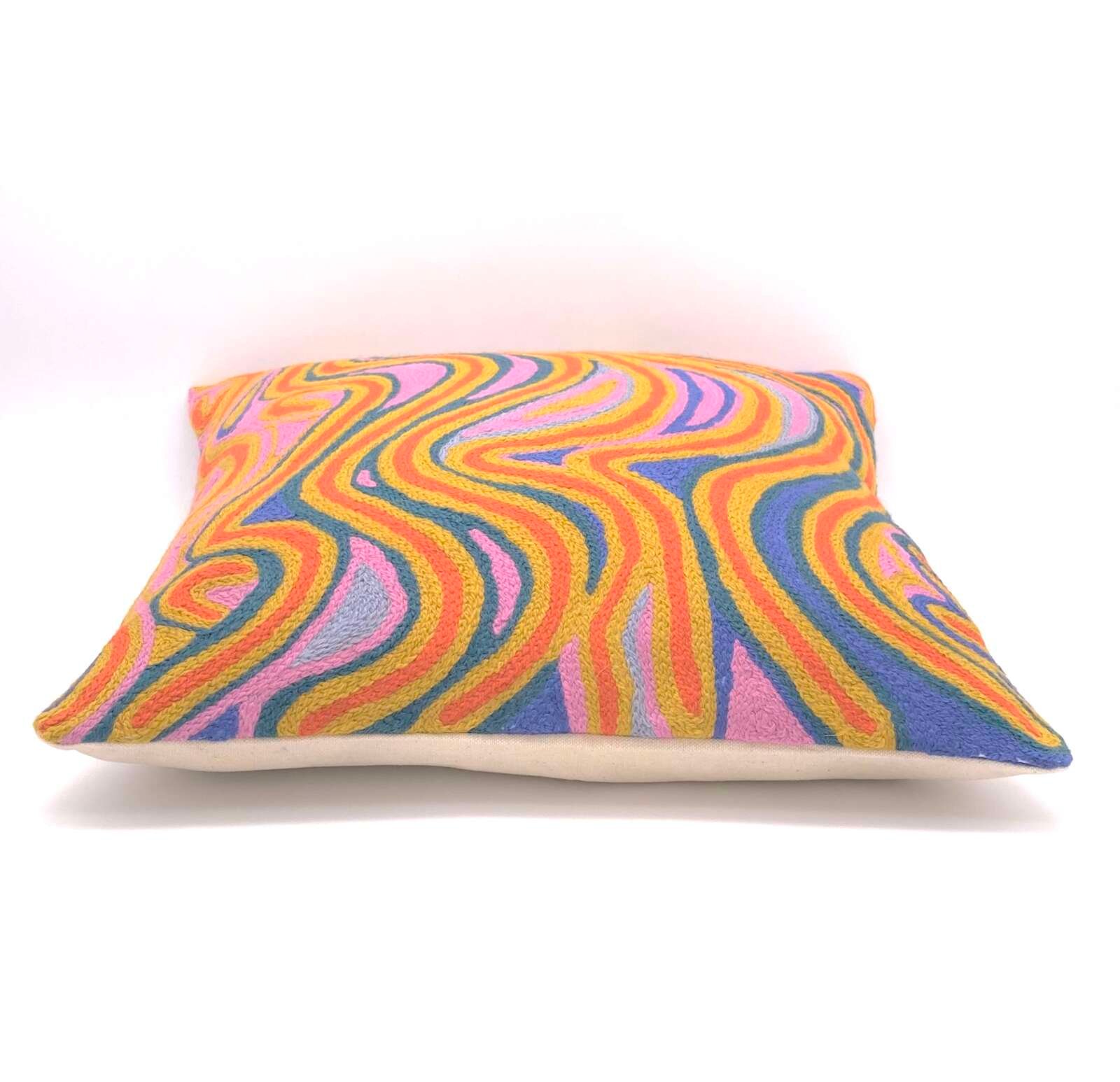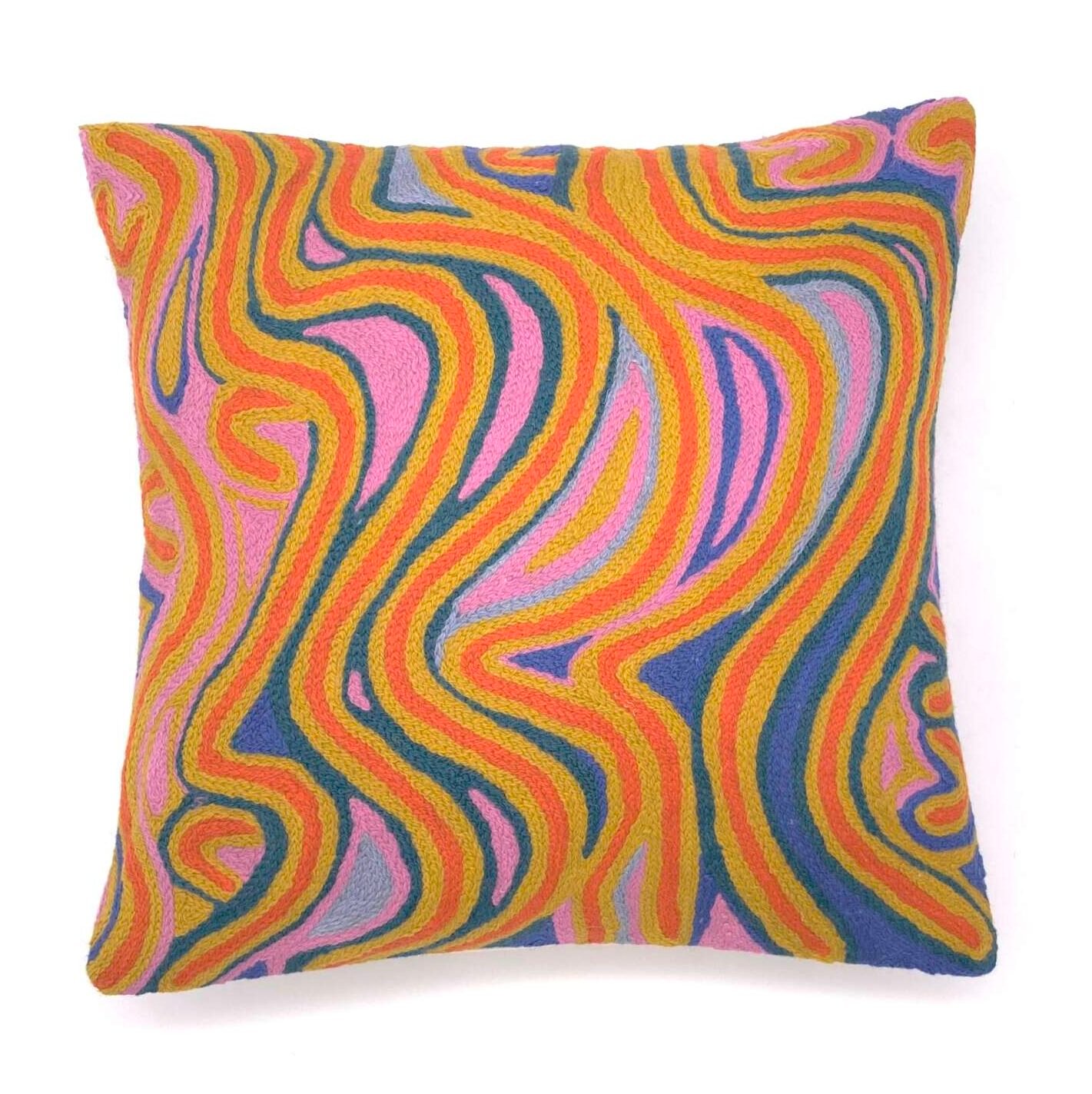 Vibrant, pure wool, fair trade cushion cover adds warmth and texture to your home. Front of each cushion is embroidered with wool and back is cotton canvas. Zip closure.