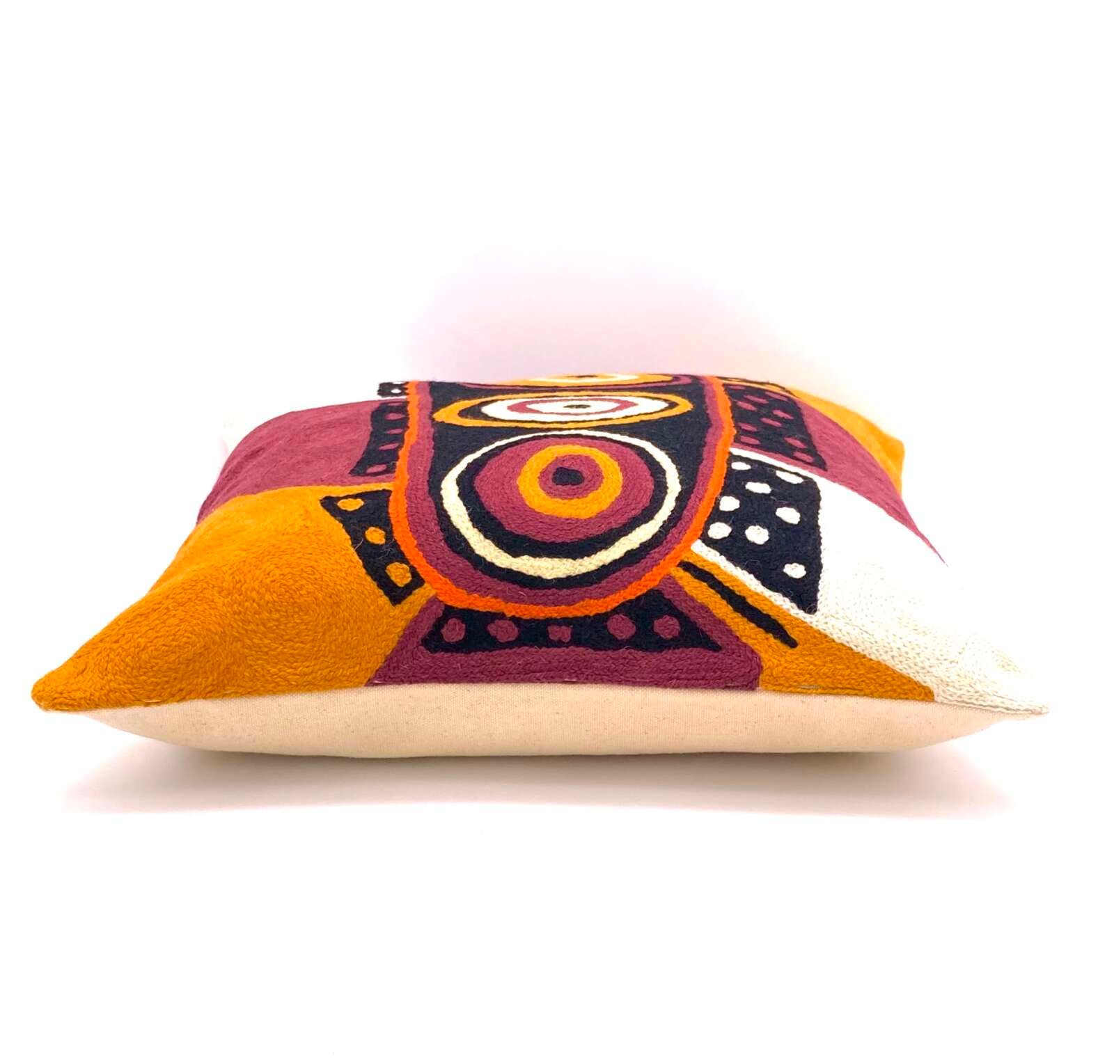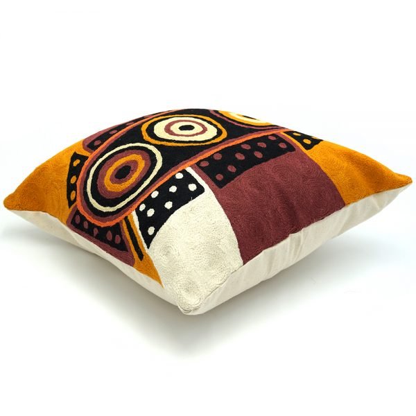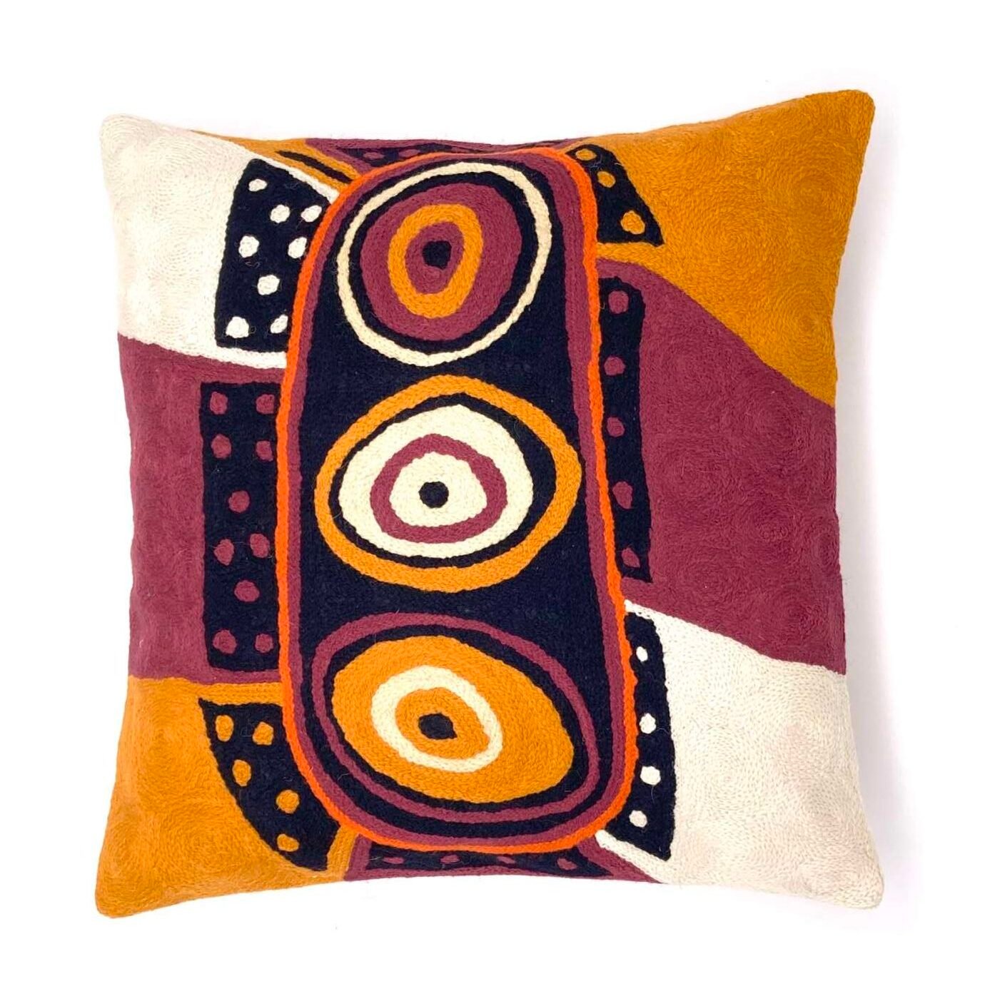 These beautiful, unique textiles are a cross-cultural collaboration combining Aboriginal designs and traditional Kashmiri rug-making techniques. Chain stitched, using hand dyed wool, each is a completely handmade piece. A more empowering way to work, this brings many direct benefits to the artists’ and their community. Control and ownership of intellectual property are also maintained. Purchase of these products guarantees a direct return to the Aboriginal artist and their community.