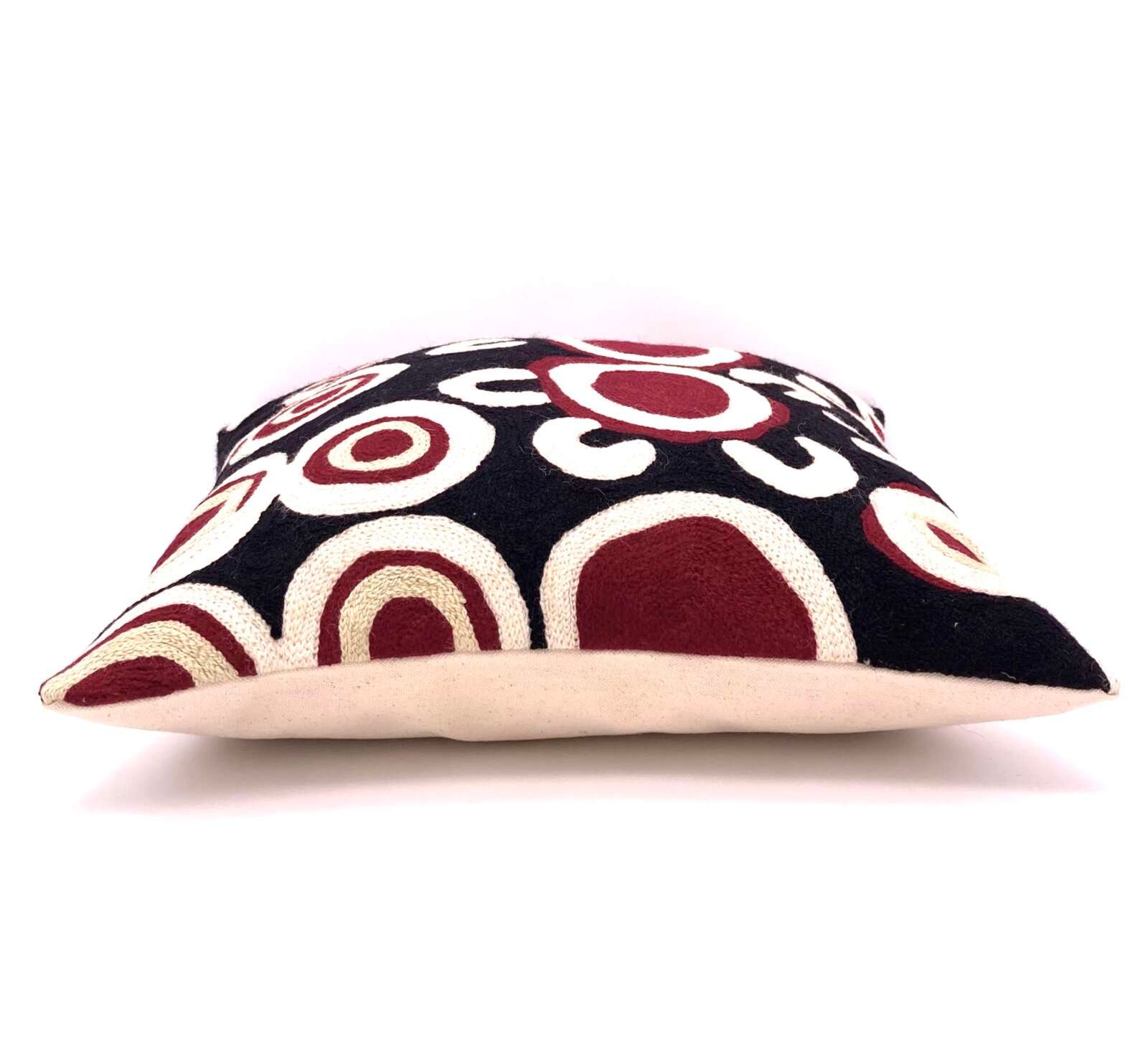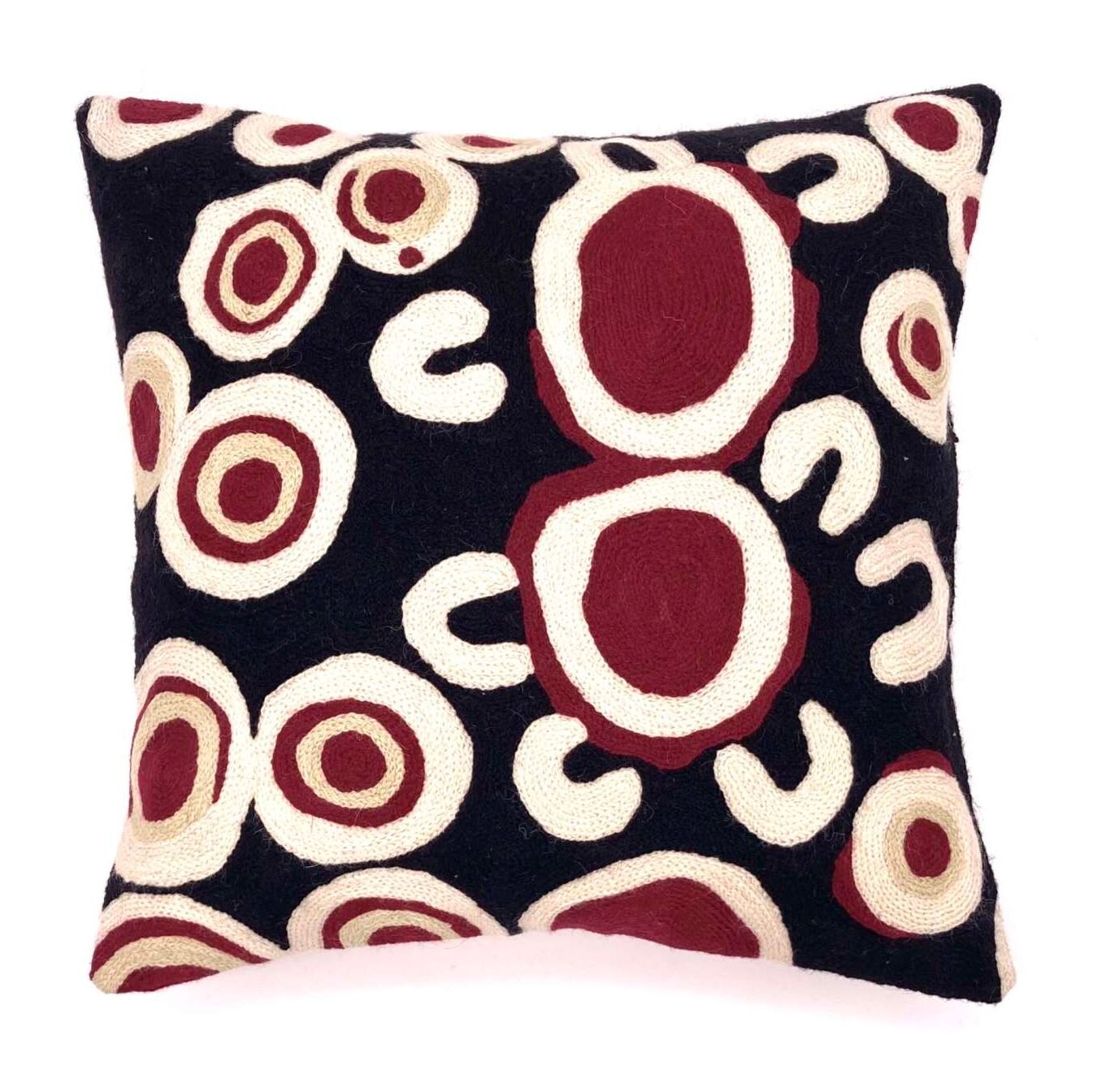 These beautiful, unique textiles are a cross-cultural collaboration combining Aboriginal designs and traditional Kashmiri rug-making techniques. Chain stitched, using hand dyed wool, each is a completely handmade piece. A more empowering way to work, this brings many direct benefits to the artists’ and their community. Control and ownership of intellectual property are also maintained. Purchase of these products guarantees a direct return to the Aboriginal artist and their community.