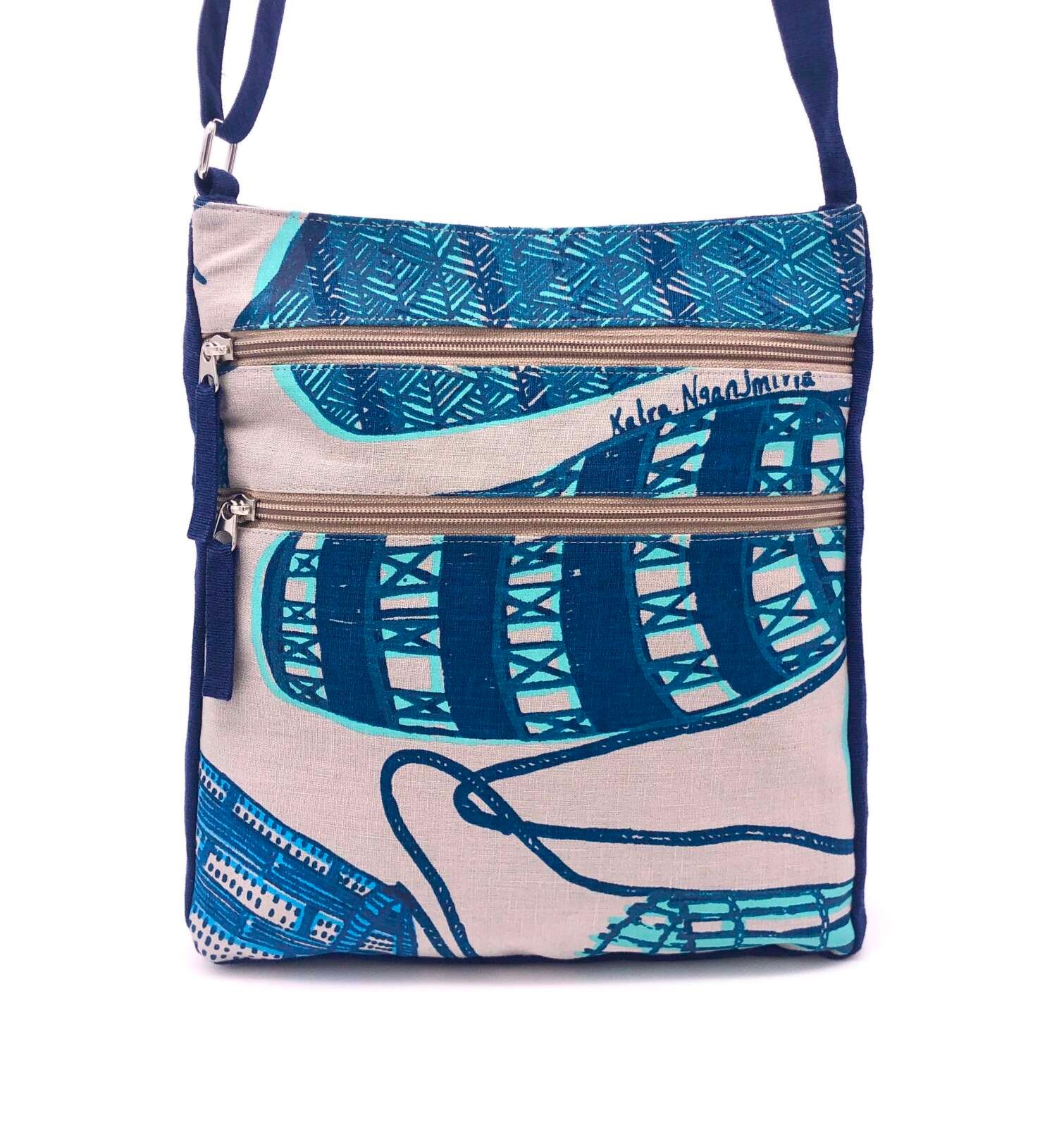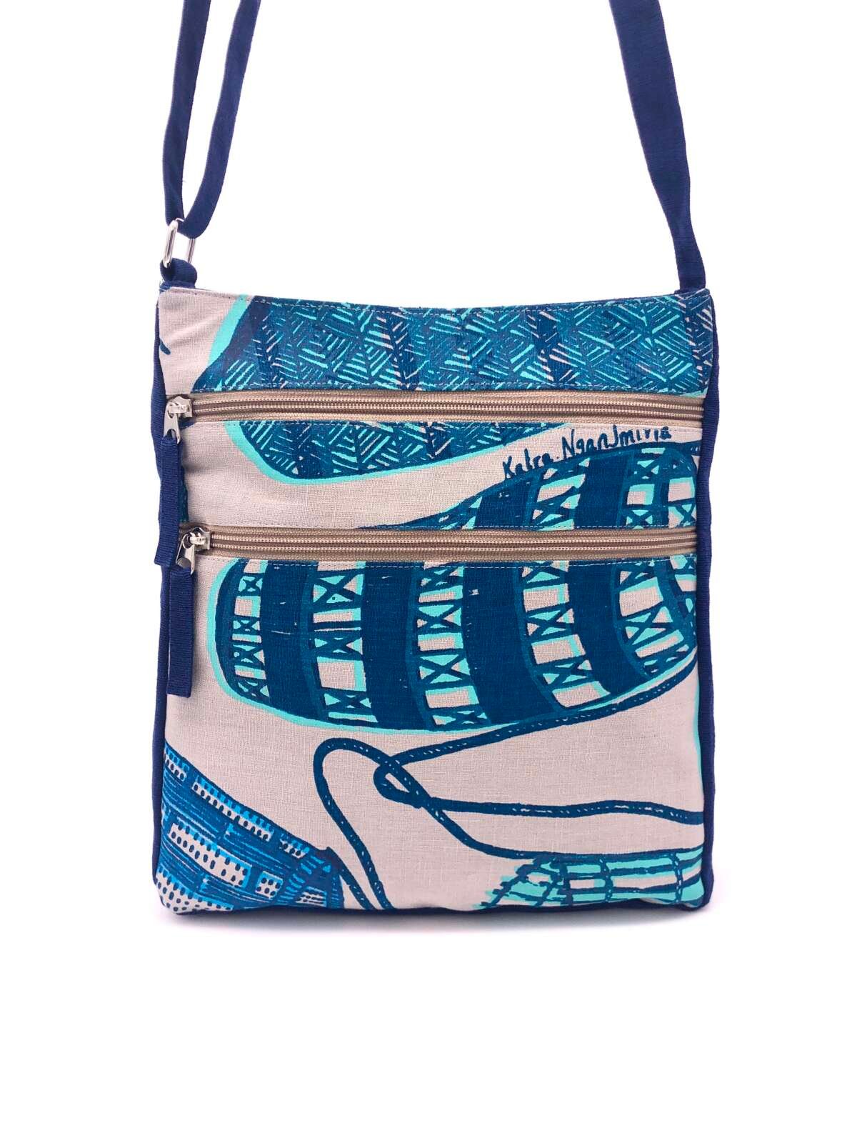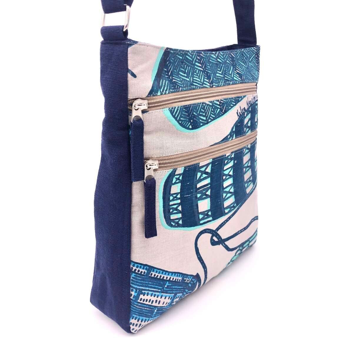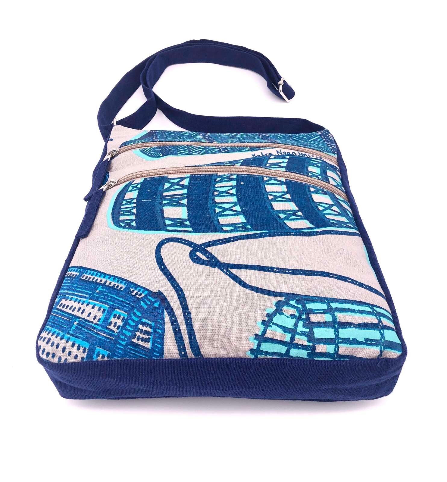 Fabric: Feature fabric is hand printed in Gunbalanya, NT on grey linen and the complementary navy blue fabric is hand woven cotton.