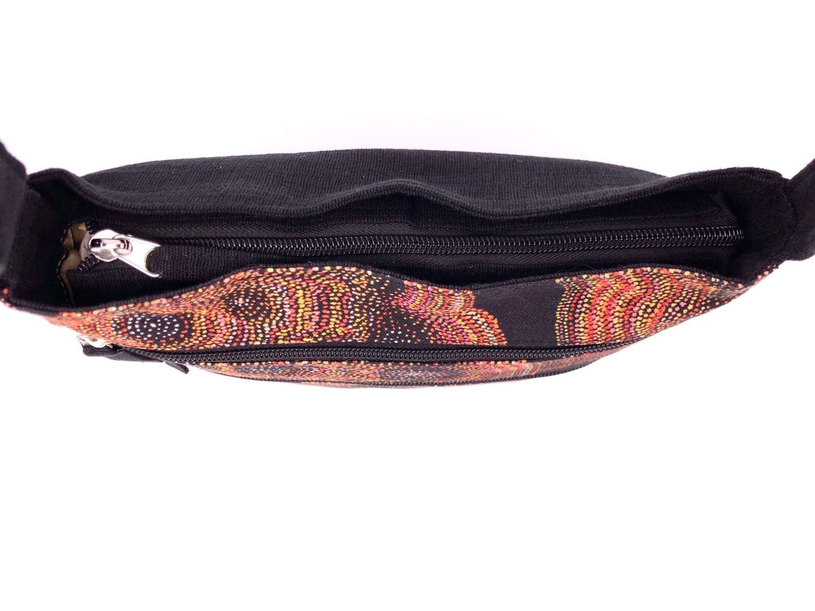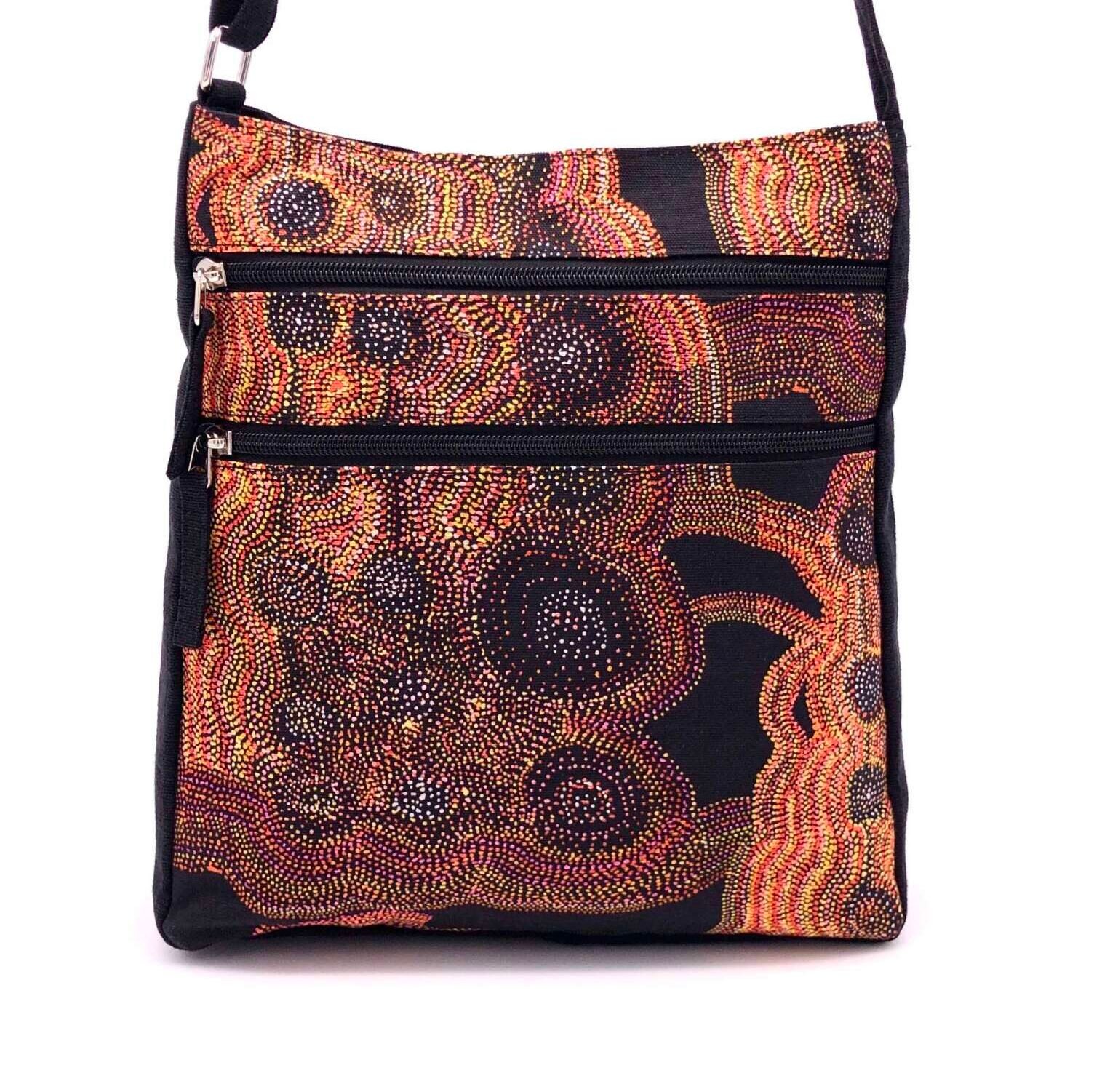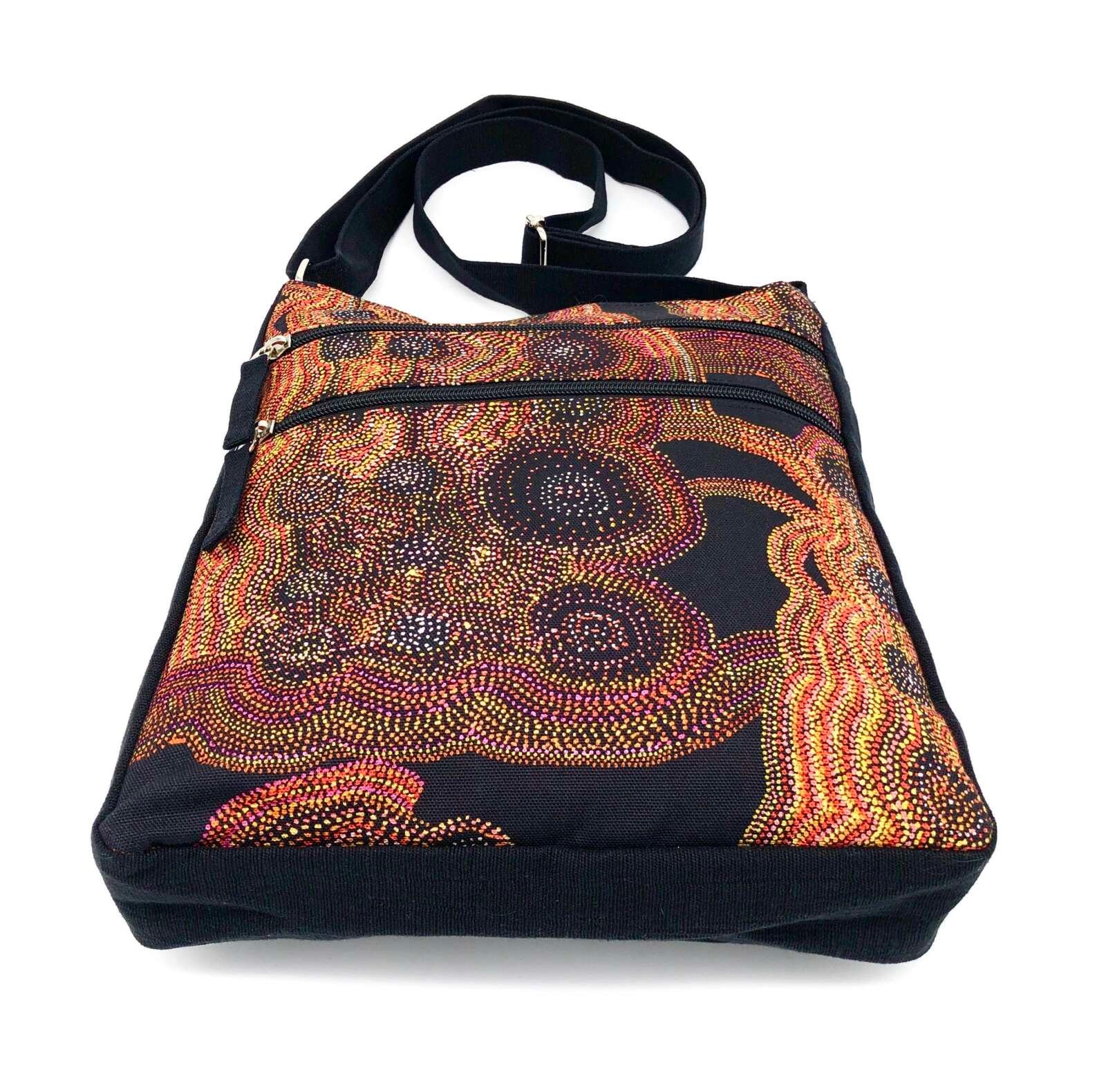 This ‘Jukurrpa’ (Dreaming) comes from Mina Mina, a very important women’s Dreaming site far to the west of Yuendumu near Lake Mackay and the WA border. The ‘kirda’ (owners) of this Dreaming are Napangardi/Napanangka women and Japangardi/Japanangka men – the area is sacred to Napangardi and Napanangka women. There are a number of ‘mulju’ (water soakages) and a ‘maluri’ (clay pan) at Mina Mina.