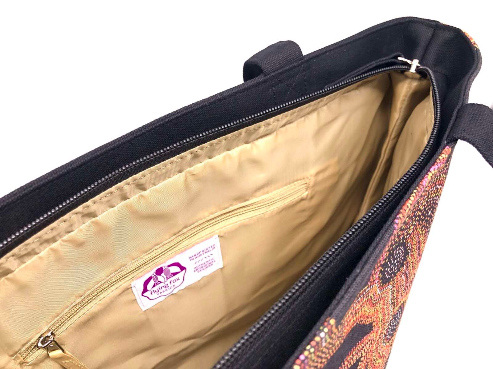 Purchasing items made from licensed fabric designs supports Aboriginal artists (who get a royalty) and their art centres.
