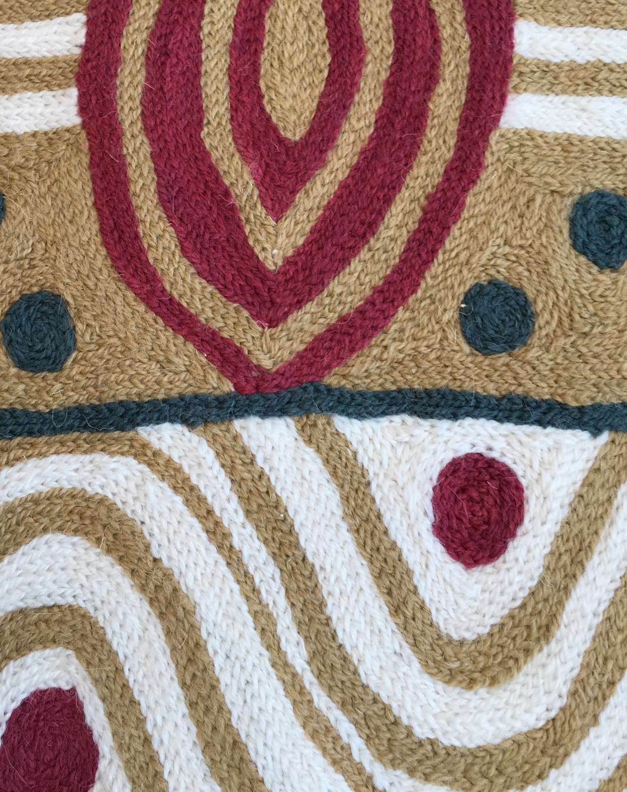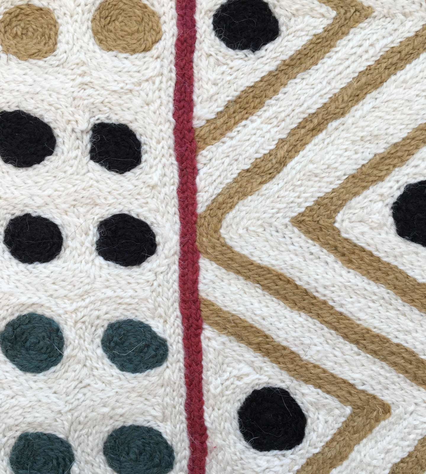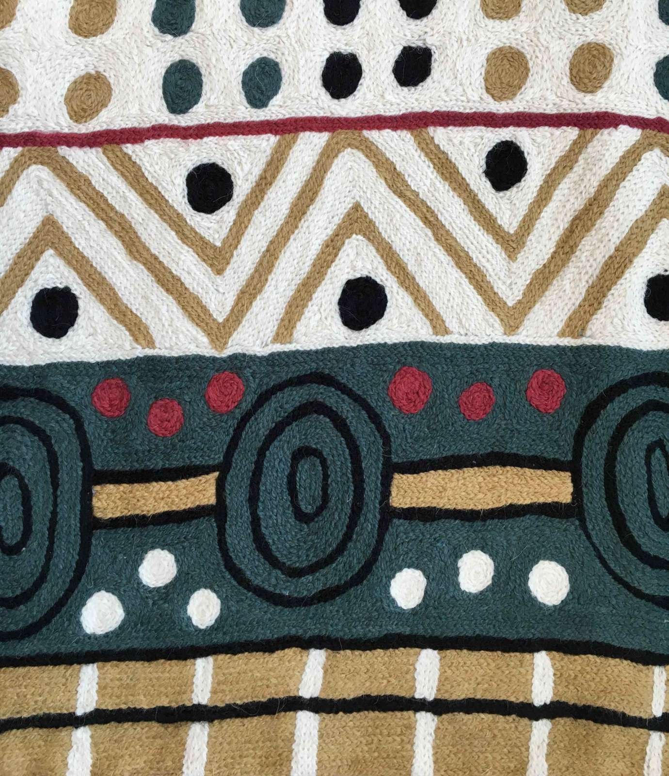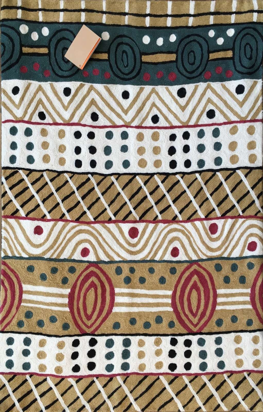 These beautiful, unique textiles are a cross-cultural collaboration combining Aboriginal designs and traditional Kashmiri rug-making techniques. Chain stitched, using hand dyed wool, each is a completely handmade piece. A more empowering way to work, this brings many direct benefits to the artists’ and their community. Control and ownership of intellectual property are also maintained. Purchase of these products guarantees a direct return to the Aboriginal artist and their community.