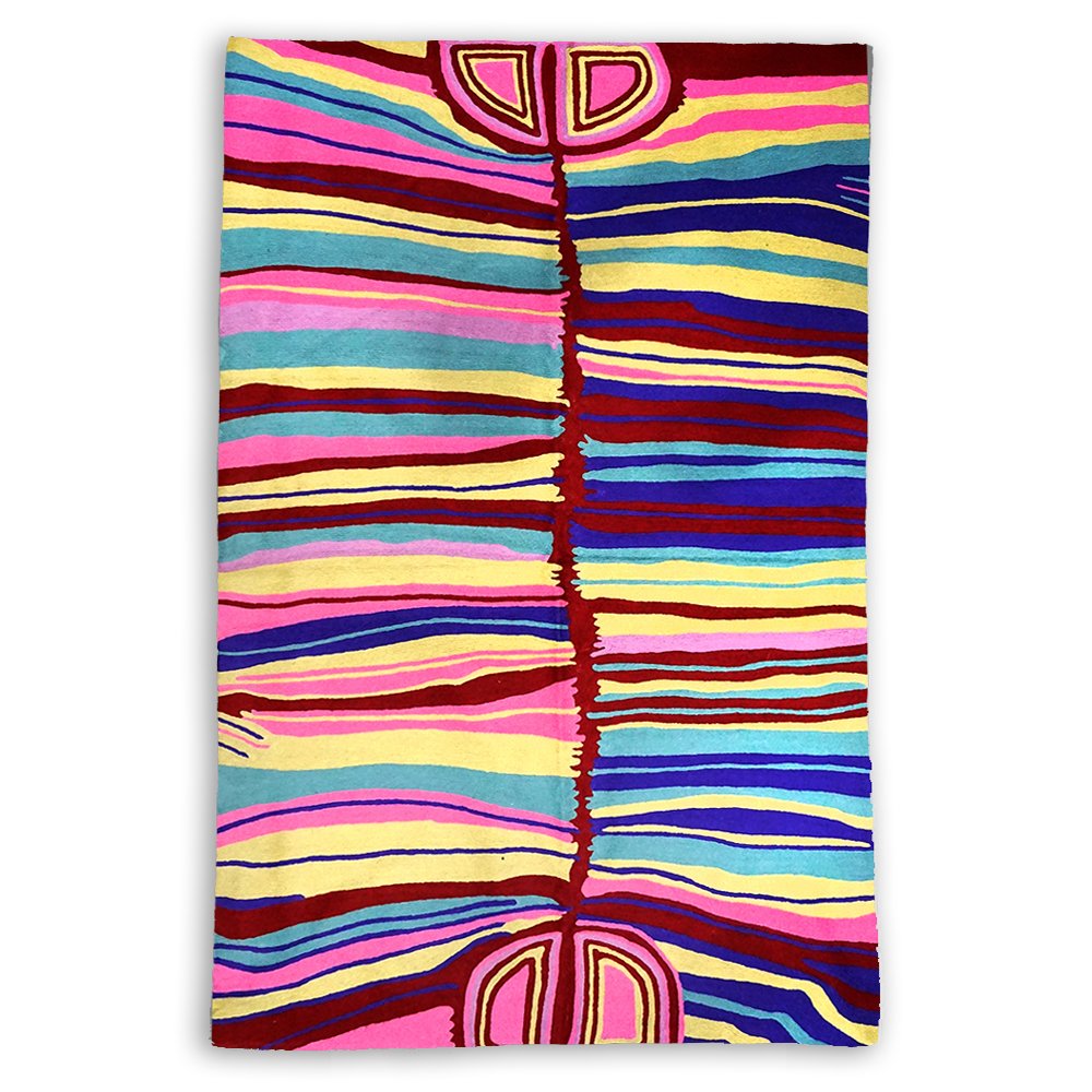 These beautiful, unique textiles are a cross-cultural collaboration combining Aboriginal designs and traditional Kashmiri rug-making techniques. Chain stitched, using hand dyed wool, each is a completely handmade piece. A more empowering way to work, this brings many direct benefits to the artists’ and their community. Control and ownership of intellectual property are also maintained. Purchase of these products guarantees a direct return to the Aboriginal artist and their community.