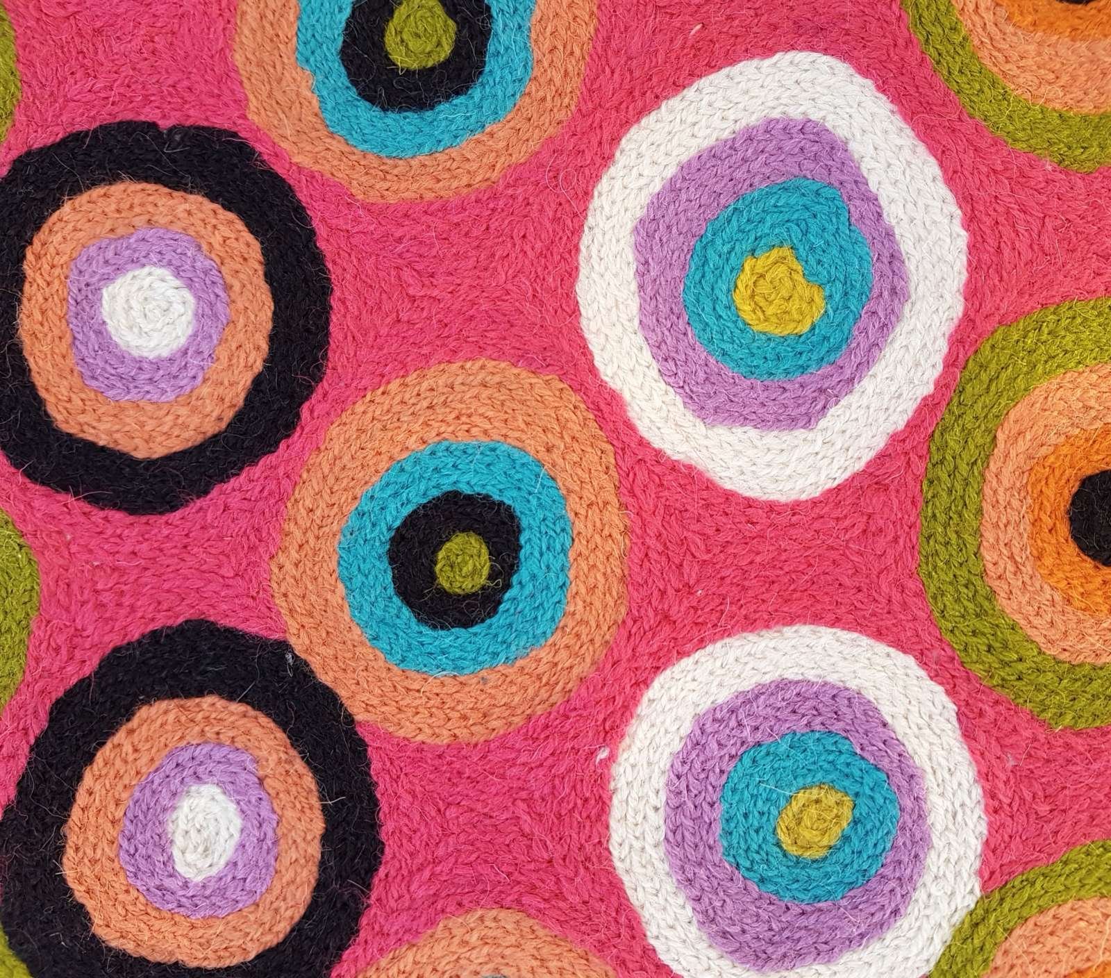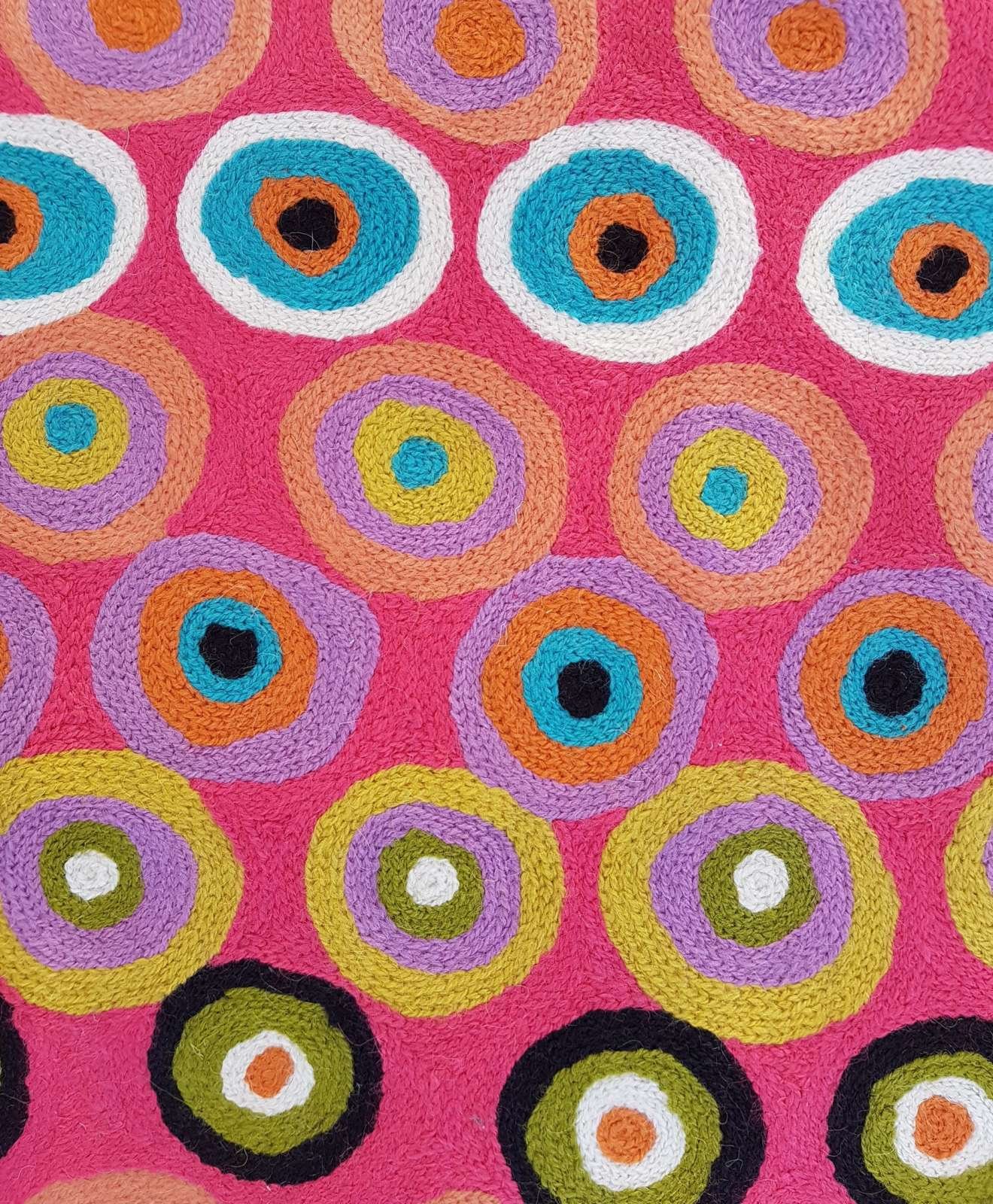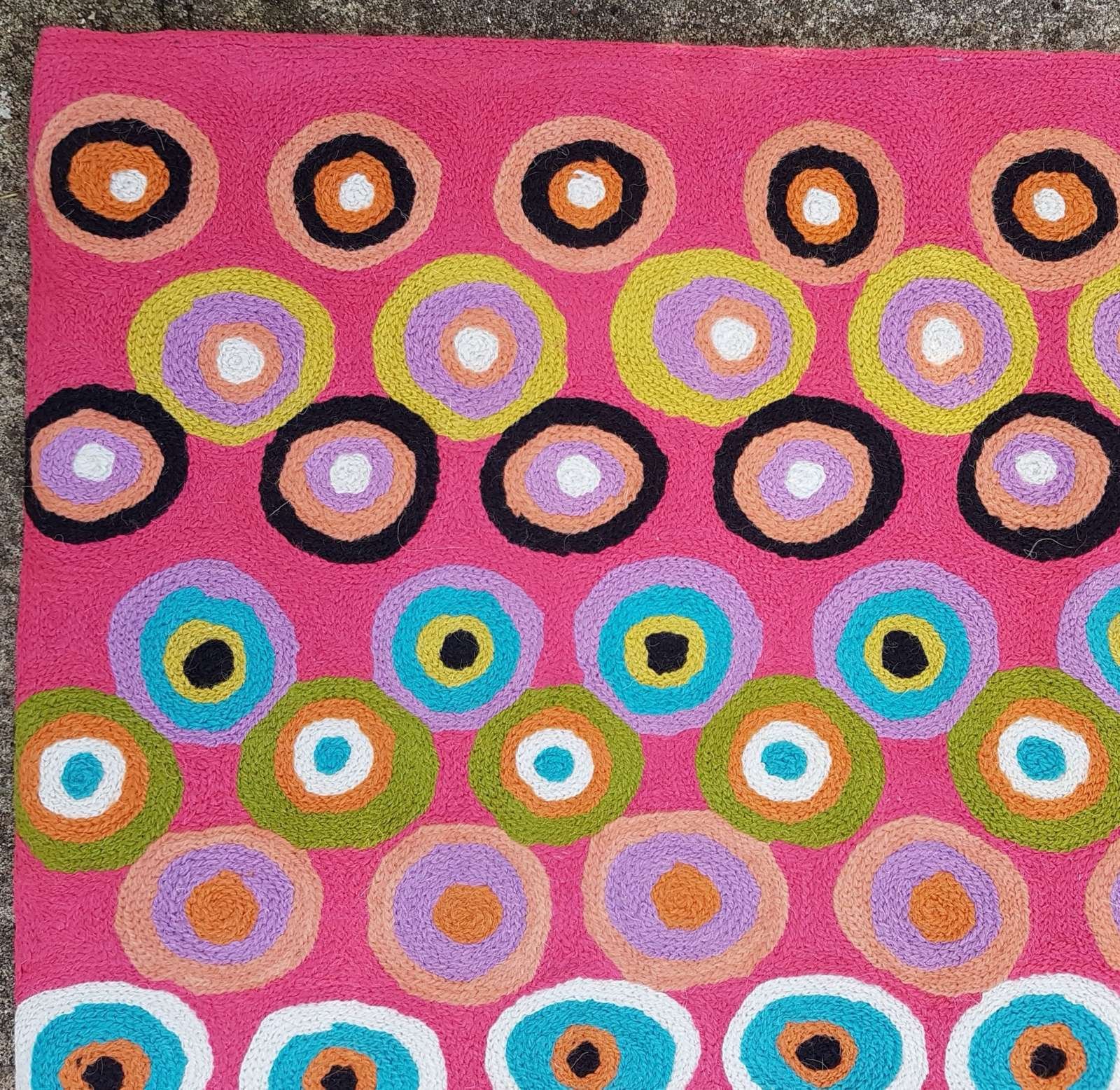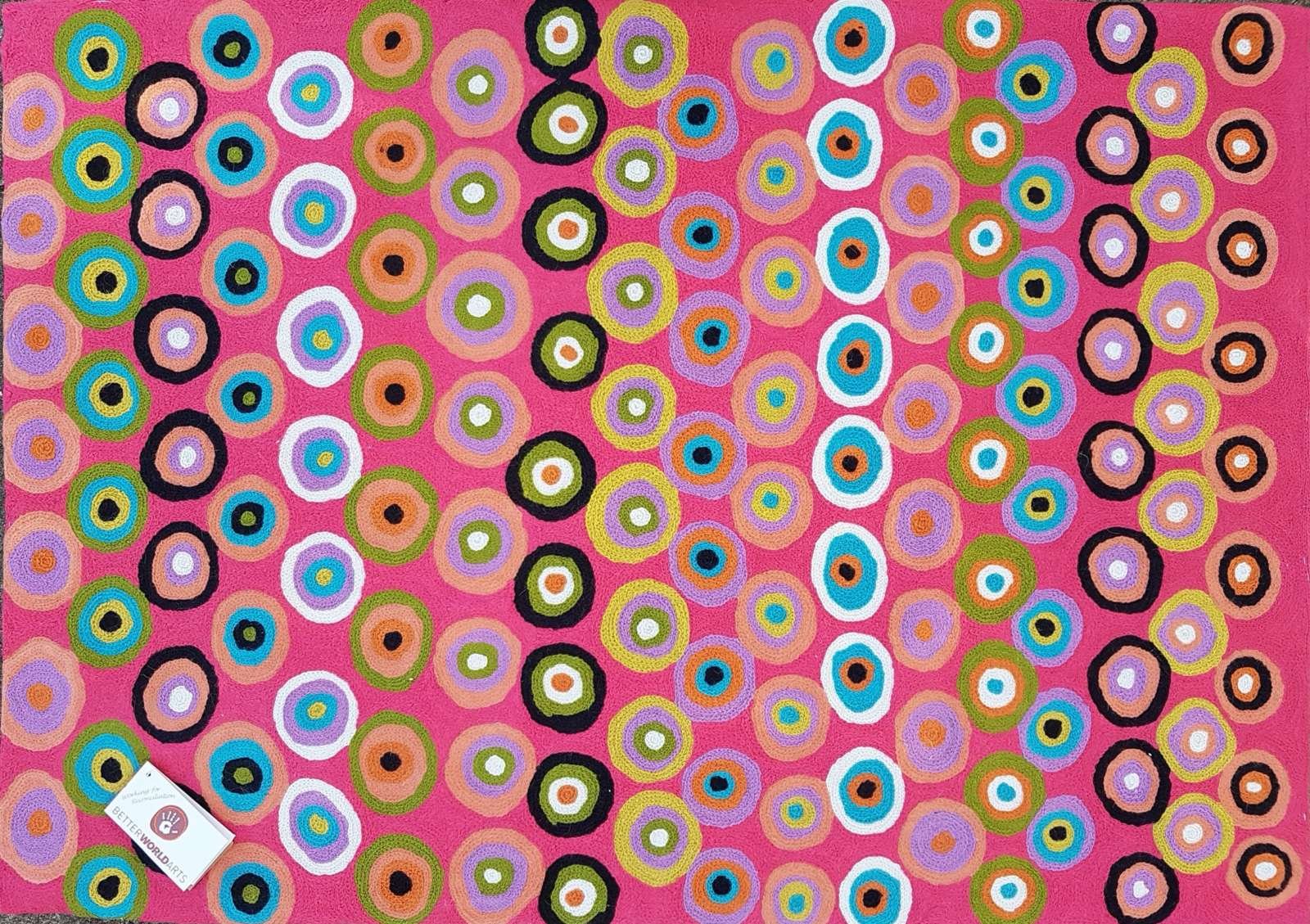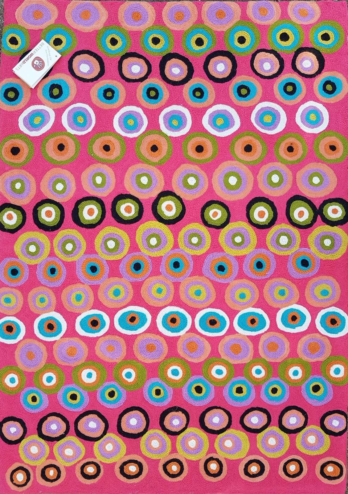 These beautiful, unique textiles are a cross-cultural collaboration combining Aboriginal designs and traditional Kashmiri rug-making techniques. Chain stitched, using hand dyed wool, each is a completely handmade piece. A more empowering way to work, this brings many direct benefits to the artists’ and their community. Control and ownership of intellectual property are also maintained. Purchase of these products guarantees a direct return to the Aboriginal artist and their community.