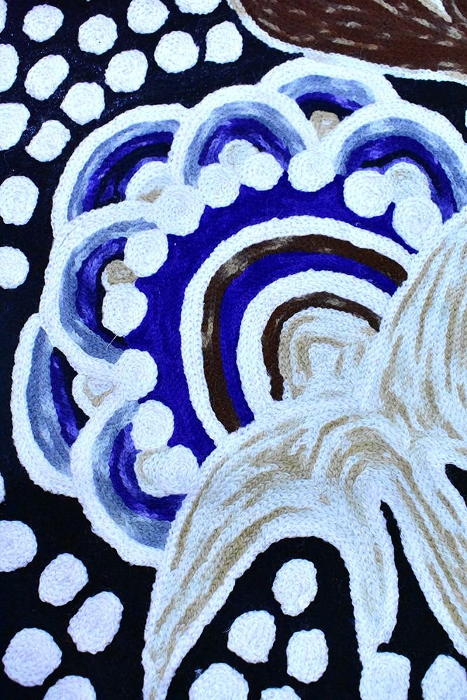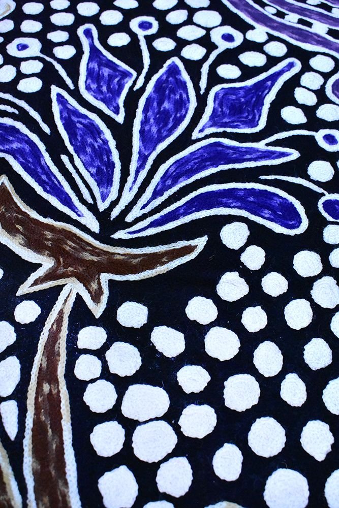 These beautiful, unique textiles are a cross-cultural collaboration combining Aboriginal designs and traditional Kashmiri rug-making techniques. Chain stitched, using hand dyed wool, each is a completely handmade piece. A more empowering way to work, this brings many direct benefits to the artists’ and their community. Control and ownership of intellectual property are also maintained. Purchase of these products guarantees a direct return to the Aboriginal artist and their community.