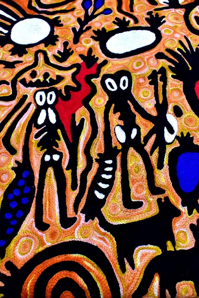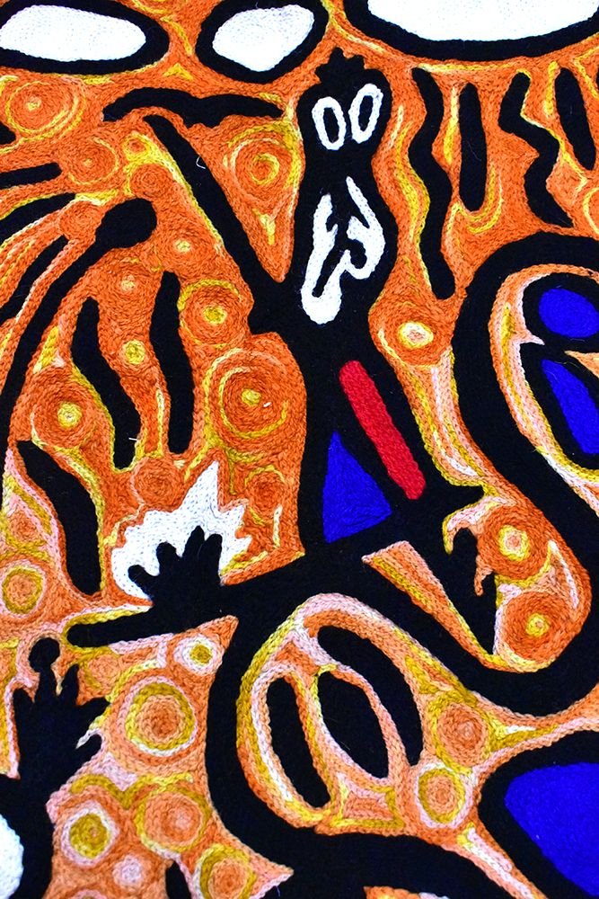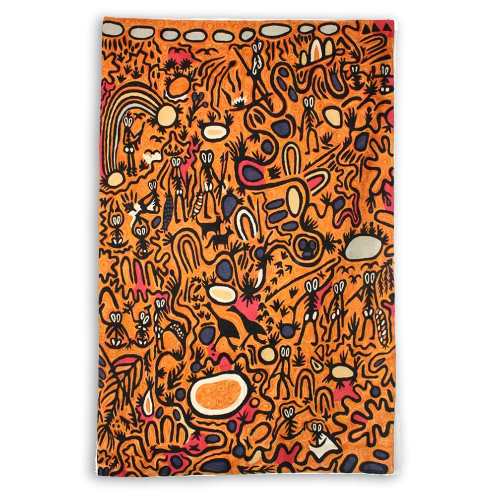 These beautiful, unique textiles are a cross-cultural collaboration combining Aboriginal designs and traditional Kashmiri rug-making techniques. Chain stitched, using hand dyed wool, each is a completely handmade piece. A more empowering way to work, this brings many direct benefits to the artists’ and their community. Control and ownership of intellectual property are also maintained. Purchase of these products guarantees a direct return to the Aboriginal artist and their community.