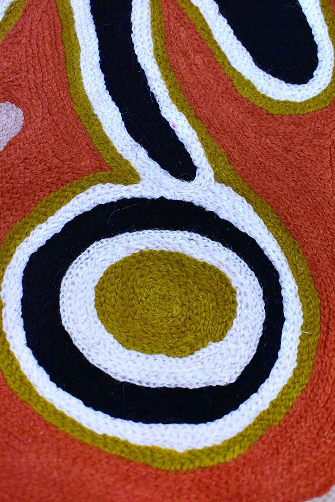 These beautiful, unique textiles are a cross-cultural collaboration combining Aboriginal designs and traditional Kashmiri rug-making techniques. Chain stitched, using hand dyed wool, each is a completely handmade piece. A more empowering way to work, this brings many direct benefits to the artists’ and their community. Control and ownership of intellectual property are also maintained. Purchase of these products guarantees a direct return to the Aboriginal artist and their community.