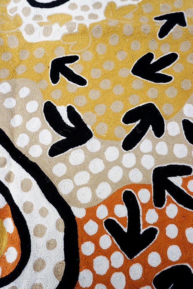 These beautiful, unique textiles are a cross-cultural collaboration combining Aboriginal designs and traditional Kashmiri rug-making techniques. Chain stitched, using hand dyed wool, each is a completely handmade piece. A more empowering way to work, this brings many direct benefits to the artists’ and their community. Control and ownership of intellectual property are also maintained. Purchase of these products guarantees a direct return to the Aboriginal artist and their community.
