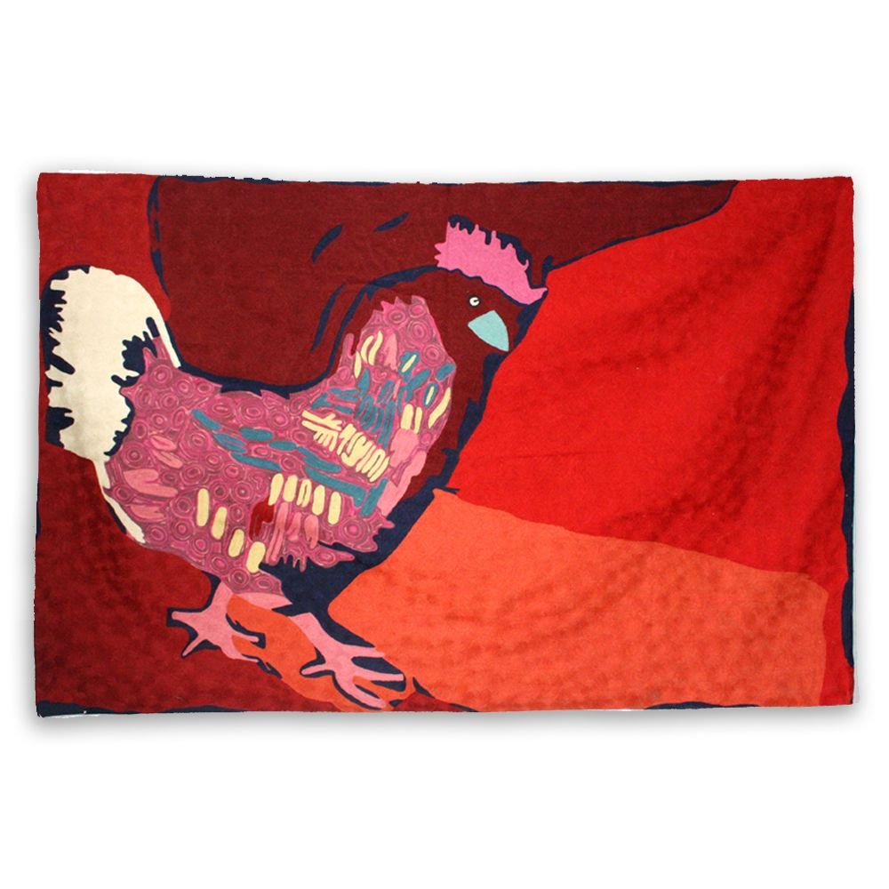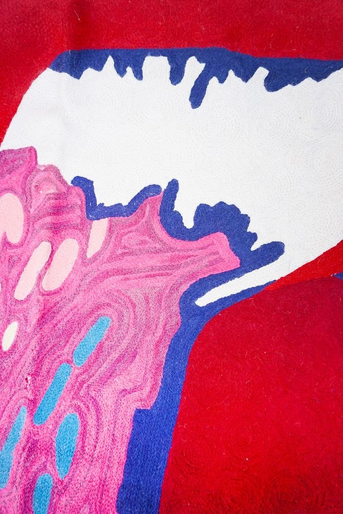 Chain-stitched kilims are a traditional rug/soft furnishings making technique from Kashmir. As people sat on the floor they were both homewares and decoration. As many artworks are painted on the ground or 3D surfaces/bodies most of the images do not have a set orientation so can also be hung portrait or landscape if preferred.