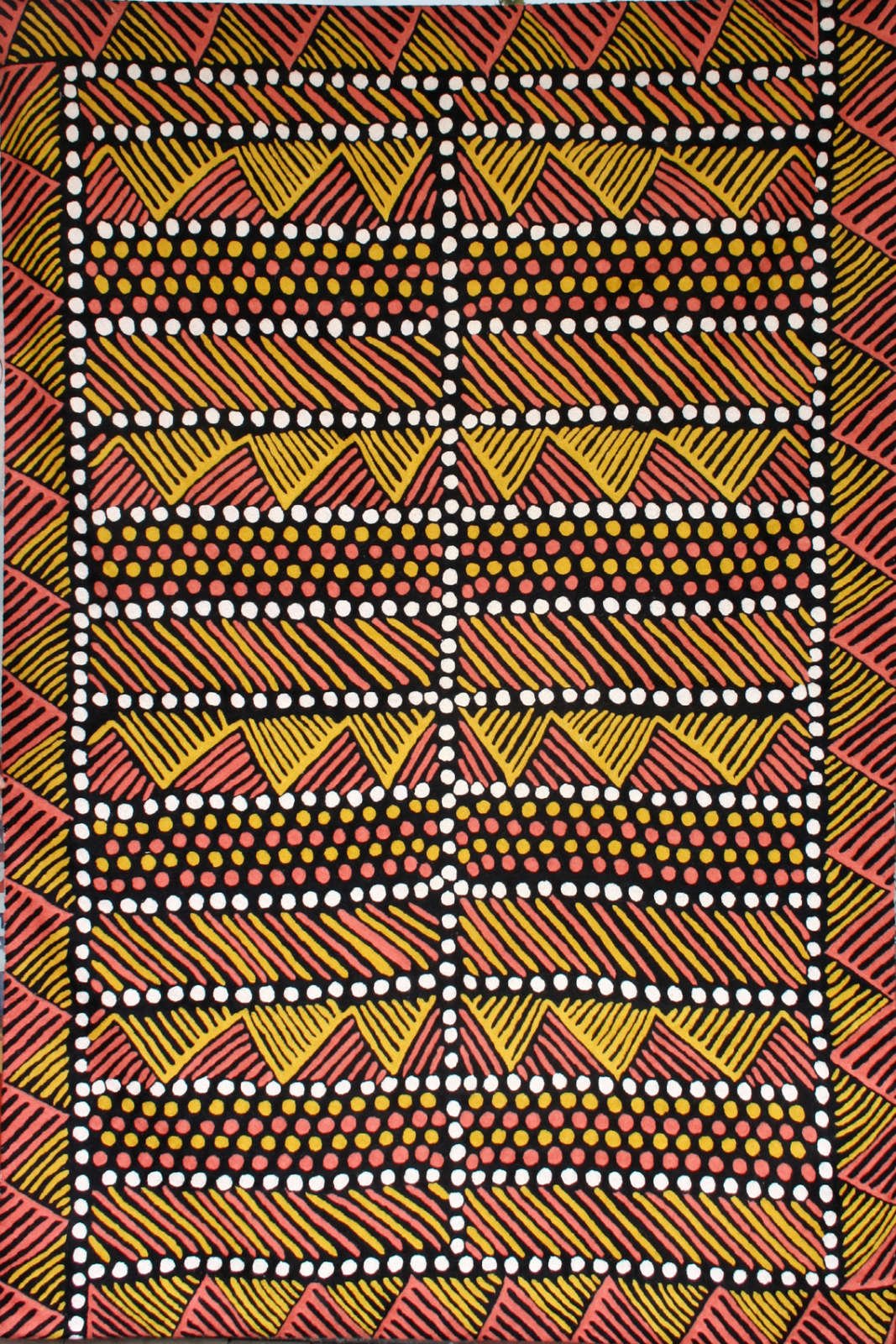 These beautiful, unique textiles are a cross-cultural collaboration combining Aboriginal designs and traditional Kashmiri rug-making techniques. Chain stitched, using hand dyed wool, each is a completely handmade piece. A more empowering way to work, this brings many direct benefits to the artists’ and their community. Control and ownership of intellectual property are also maintained. Purchase of these products guarantees a direct return to the Aboriginal artist and their community.