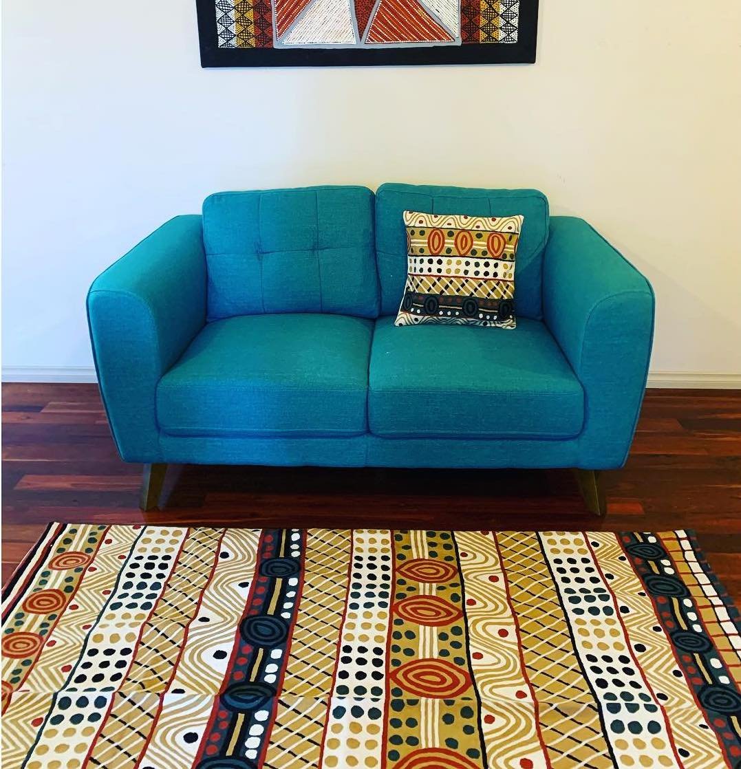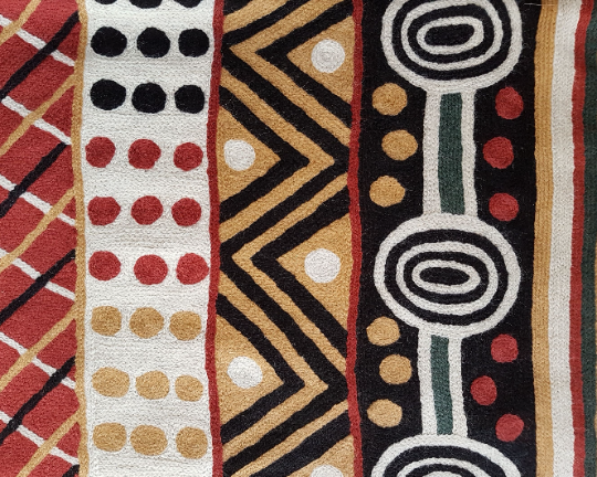 These beautiful, unique textiles are a cross-cultural collaboration combining Aboriginal designs and traditional Kashmiri rug-making techniques. Chain stitched, using hand dyed wool, each is a completely handmade piece. A more empowering way to work, this brings many direct benefits to the artists’ and their community. Control and ownership of intellectual property are also maintained. Purchase of these products guarantees a direct return to the Aboriginal artist and their community.