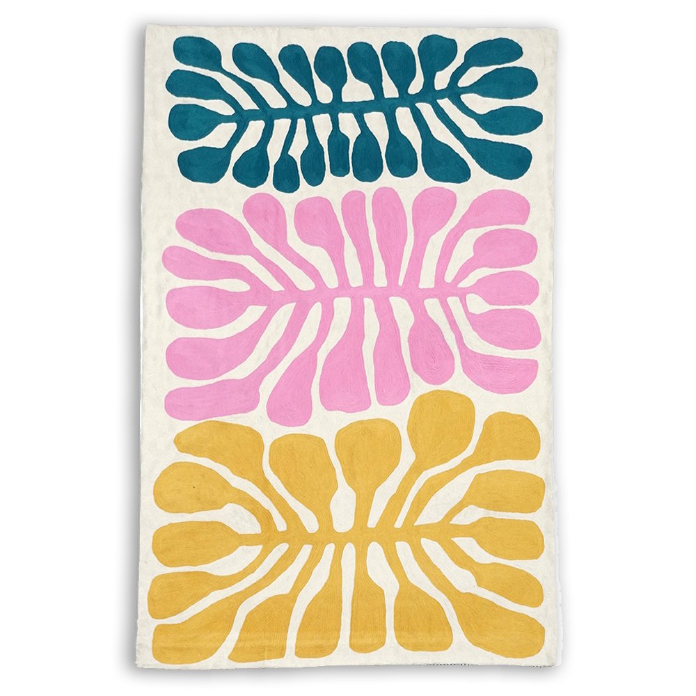 Chain-stitched kilims are a traditional rug/soft furnishings making technique from Kashmir. As people sat on the floor they were both homewares and decoration. As many artworks are painted on the ground or 3D surfaces/bodies most of the images do not have a set orientation so can also be hung portrait or landscape if preferred.