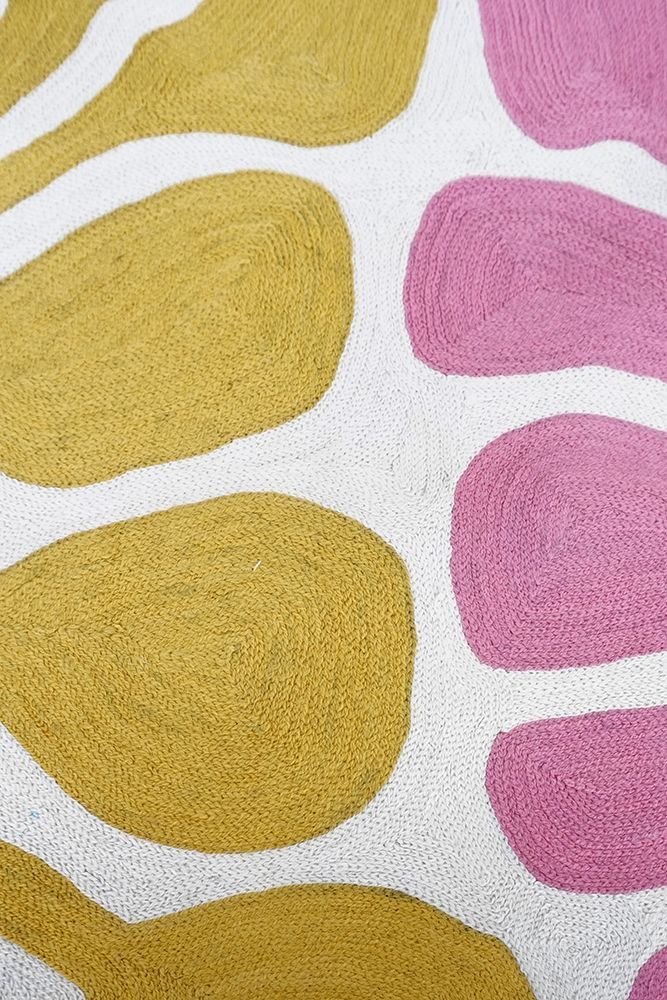 These beautiful, unique textiles are a cross-cultural collaboration combining Aboriginal designs and traditional Kashmiri rug-making techniques. Chain stitched, using hand dyed wool, each is a completely handmade piece. A more empowering way to work, this brings many direct benefits to the artists’ and their community. Control and ownership of intellectual property are also maintained. Purchase of these products guarantees a direct return to the Aboriginal artist and their community.