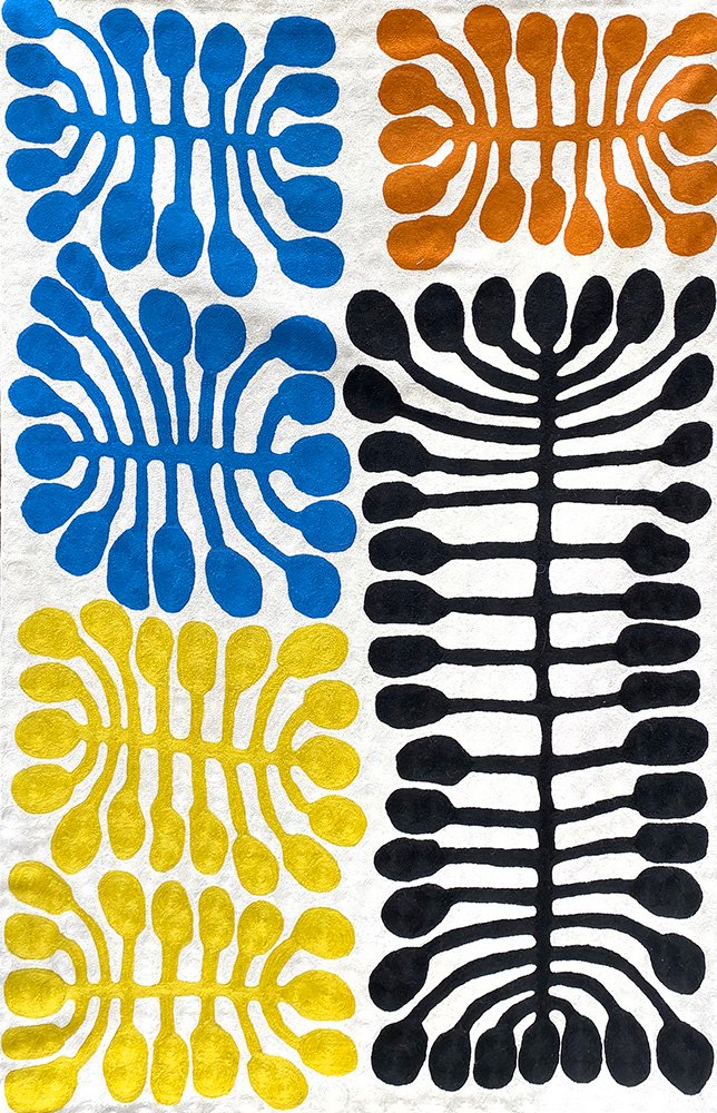 These beautiful, unique textiles are a cross-cultural collaboration combining Aboriginal designs and traditional Kashmiri rug-making techniques. Chain stitched, using hand dyed wool, each is a completely handmade piece. A more empowering way to work, this brings many direct benefits to the artists’ and their community. Control and ownership of intellectual property are also maintained. Purchase of these products guarantees a direct return to the Aboriginal artist and their community.