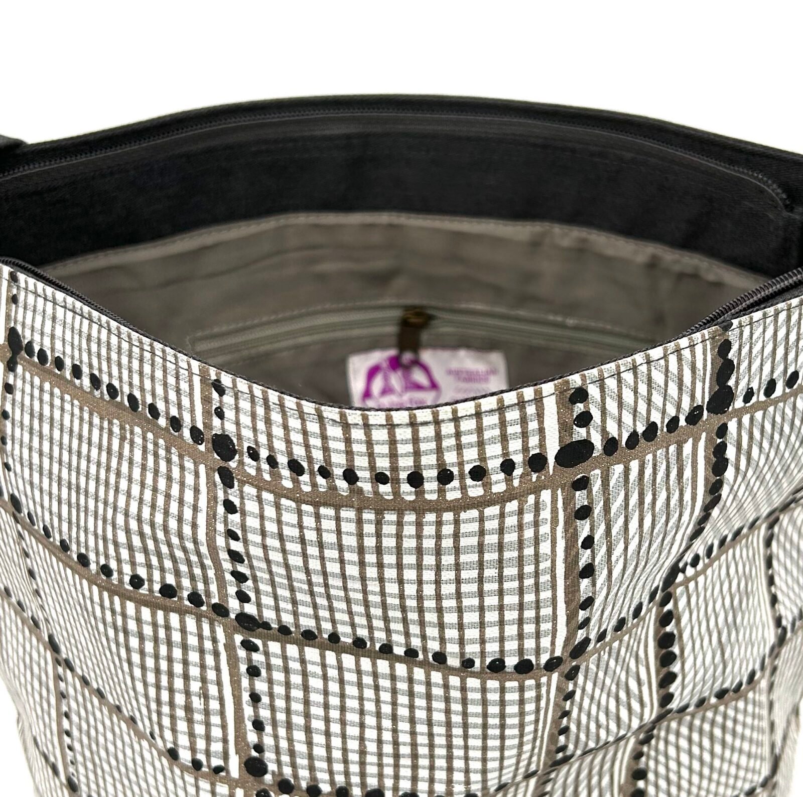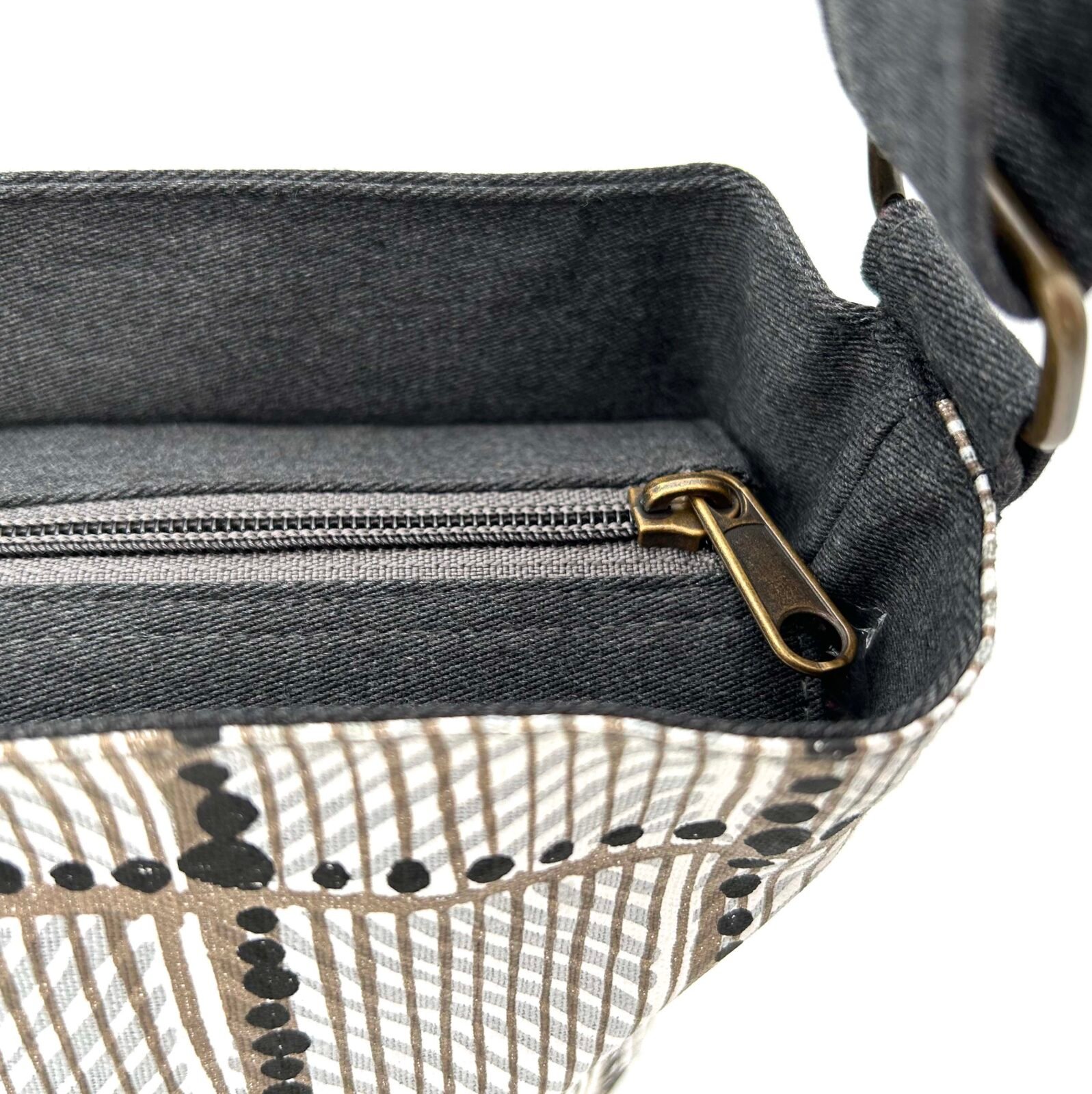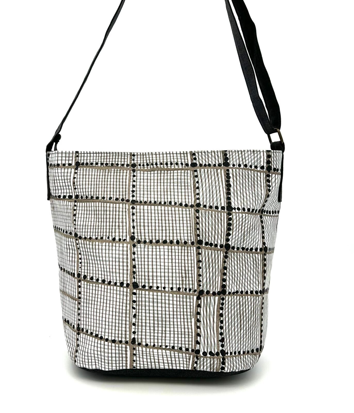 Colours: The base cloth is sand and the inks are black and white. The complementary fabric is dark grey.