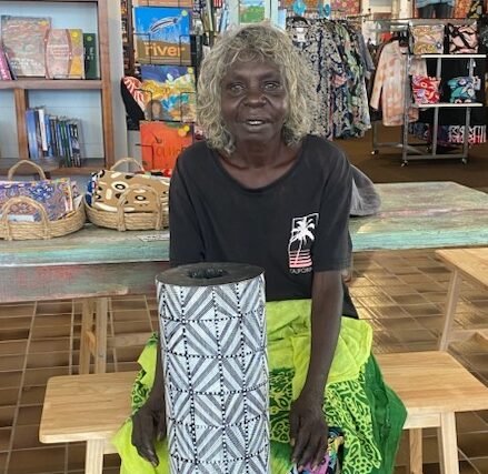 Susan has depicted the leaves of the man-mobban (billygoat plum tree, Terminalia carpentariae). Its small green edible plums can be found in abundance on Susan’s homeland, Mumeka.