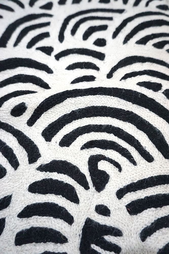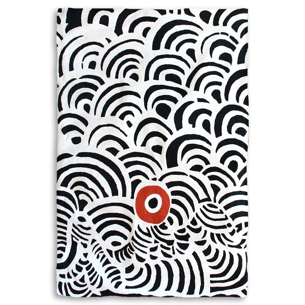 These beautiful, unique textiles are a cross-cultural collaboration combining Aboriginal designs and traditional Kashmiri rug-making techniques. Chain stitched, using hand dyed wool, each is a completely handmade piece. A more empowering way to work, this brings many direct benefits to the artists’ and their community. Control and ownership of intellectual property are also maintained. Purchase of these products guarantees a direct return to the Aboriginal artist and their community.