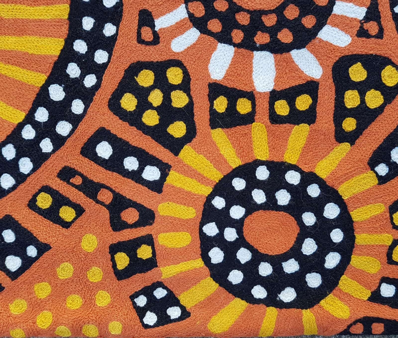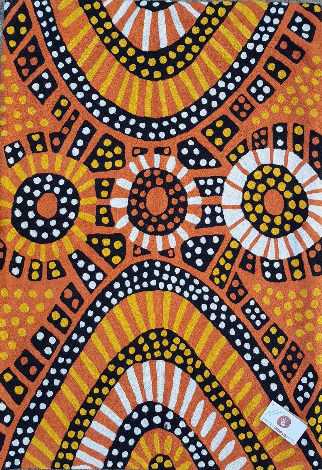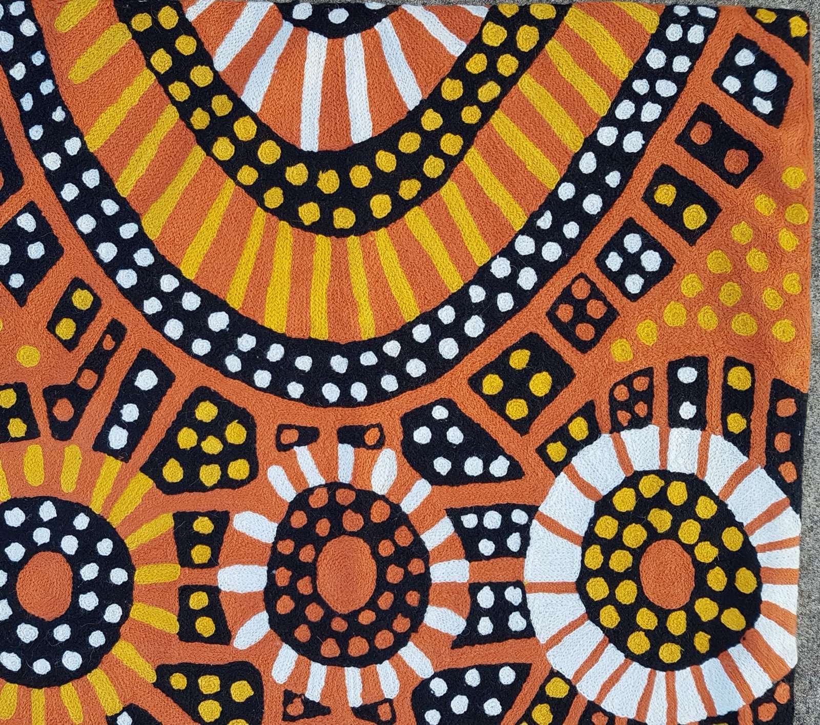 These beautiful, unique textiles are a cross-cultural collaboration combining Aboriginal designs and traditional Kashmiri rug-making techniques. Chain stitched, using hand dyed wool, each is a completely handmade piece. A more empowering way to work, this brings many direct benefits to the artists’ and their community. Control and ownership of intellectual property are also maintained. Purchase of these products guarantees a direct return to the Aboriginal artist and their community.
