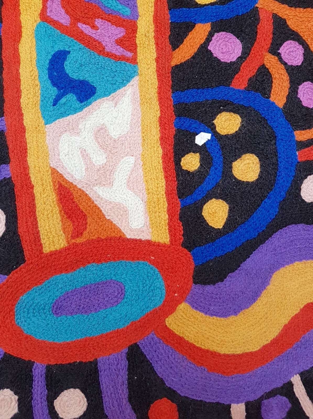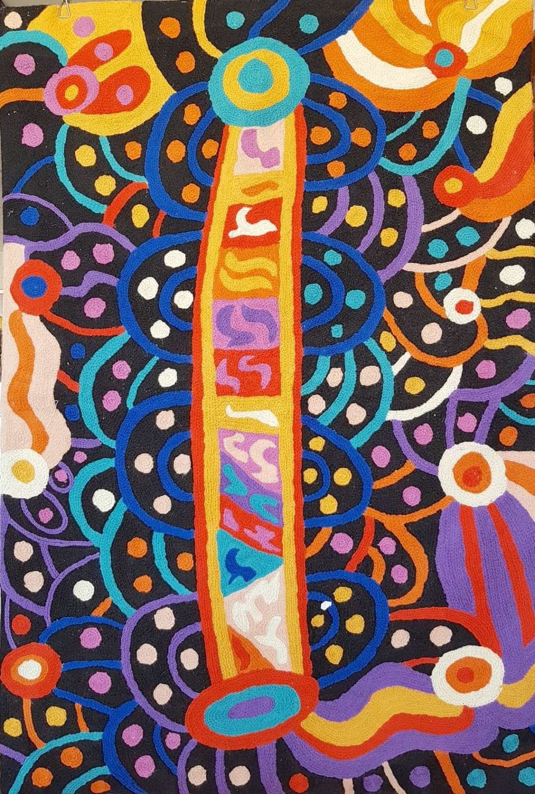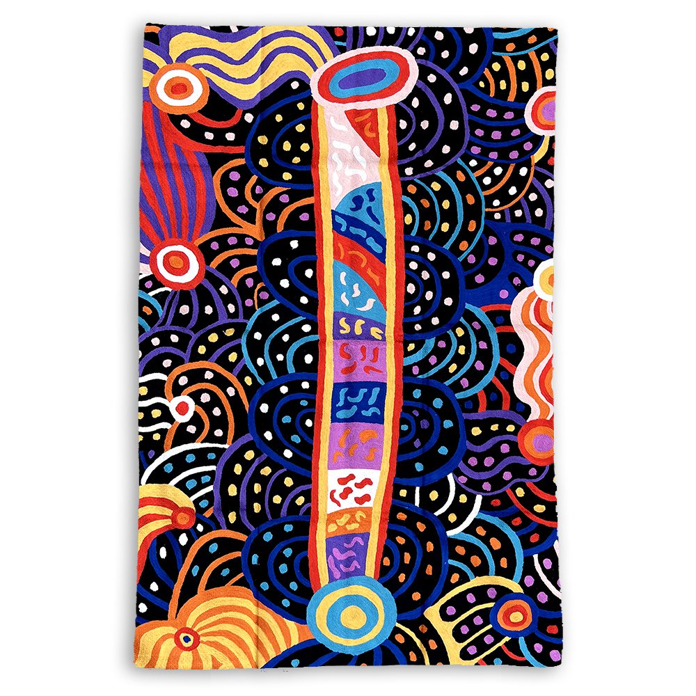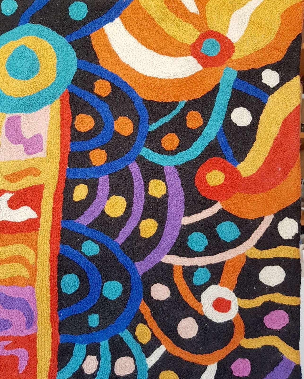 These beautiful, unique textiles are a cross-cultural collaboration combining Aboriginal designs and traditional Kashmiri rug-making techniques. Chain stitched, using hand dyed wool, each is a completely handmade piece. A more empowering way to work, this brings many direct benefits to the artists’ and their community. Control and ownership of intellectual property are also maintained. Purchase of these products guarantees a direct return to the Aboriginal artist and their community.