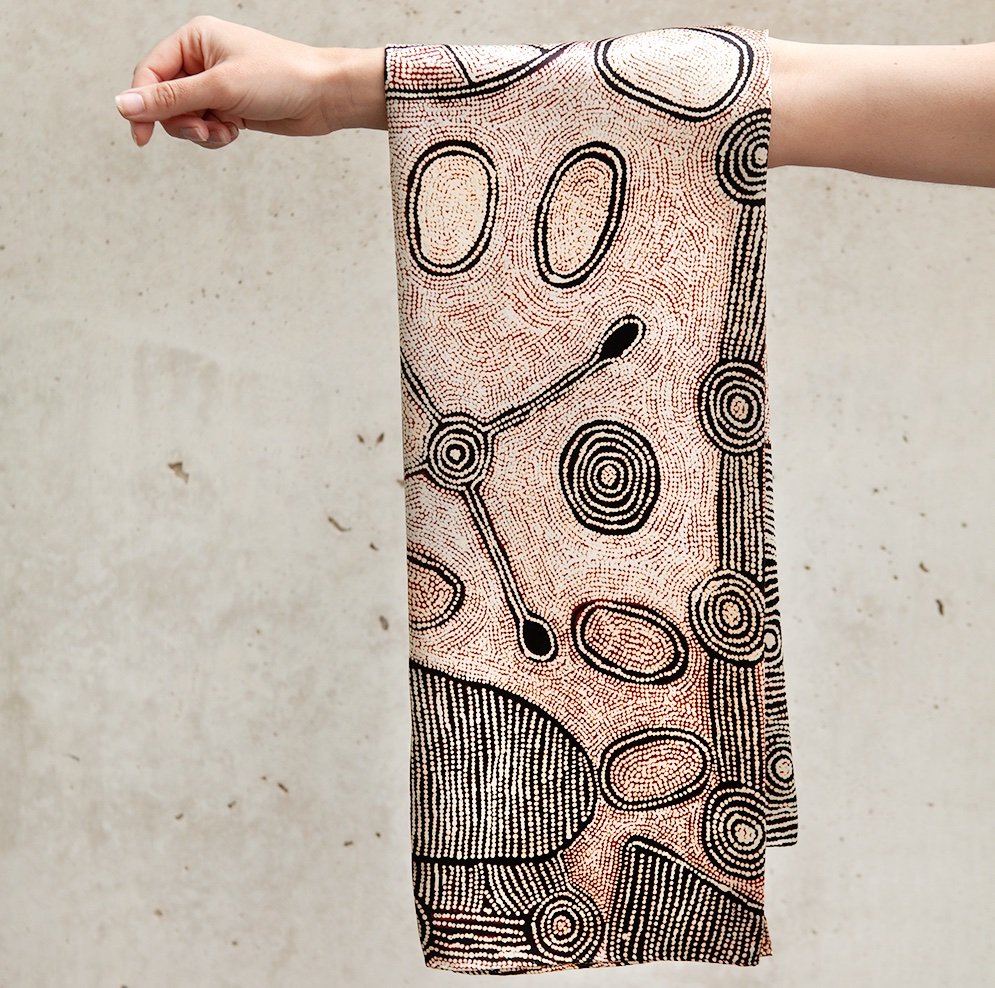 The symbols in this painting represent the geographical features of the landscape traversed by the ancestral women along their journey, and the bush foods they harvested along the way. Yalti is known for her classical colour palette and complex symbolism that combine to great effect, creating works with a compelling visual narrative.