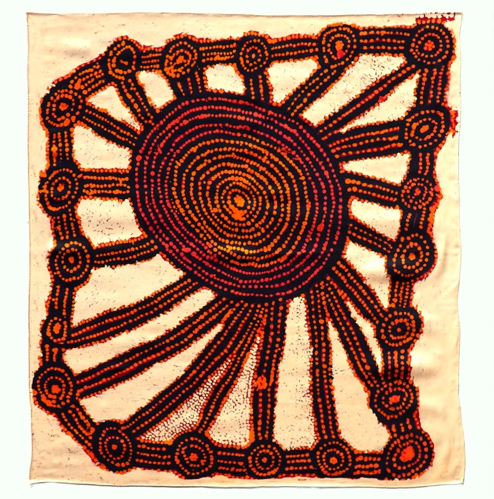 Tjungurrayi’s untitled painting depicts Kirritjinna, a rockhole site south-west of Lake MacDonald, a vast ephemeral salt lake straddling the border between Western Australia and the Northern Territory. During ancestral times, a large group of Tingari Men camped at this site before travelling to Lake MacDonald. The legends of the Tingari are secret-scared in nature, but in general, they are a group of ancestral Dreaming beings who traversed the country, creating and transforming the landscape through their travels. The Tingari Men were usually followed by Tingari Women and accompanied by novices, and their adventures are enshrined in numerous song cycles.